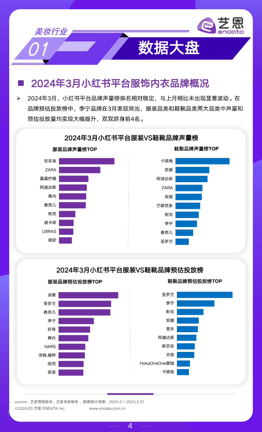 2024年3月,小红书平台品牌声量榜排名相对稳定,与上月相比未出现显著波动。在品牌预估投放榜中,李宁品牌在3月表现突出;