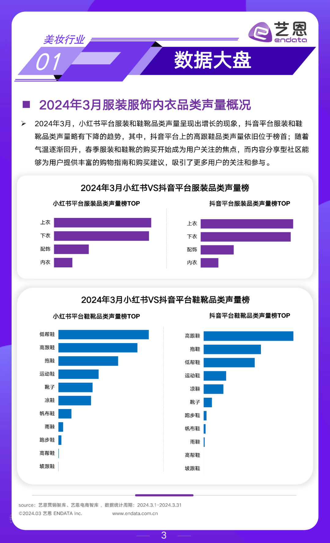 2024年3月,小红书平台服装和鞋靴品类声量呈现出增长的现象,抖音平台服装和鞋靴品类声量略有下降的趋势;