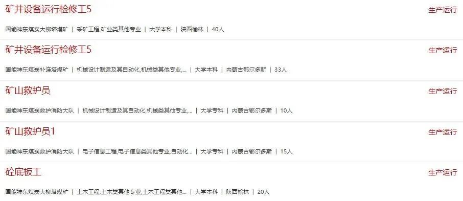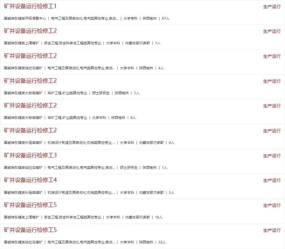 生产岗位:矿井设备运行检修工(机械类、机械工程类、机械设计制造类、机电设备类、电气类、自动化类、电气工程类、地质类、资源勘查类、测绘地理信息类、煤炭类、安全工程与科学类、矿业类、电子信息类、计算机类)、地质防治水工(地质类)、砼底板工(土木类、土木工程类)、矿山救护员(机械类、矿业类、电子信息类、自动化类、公安技术类)、智能运维工(计算机类)