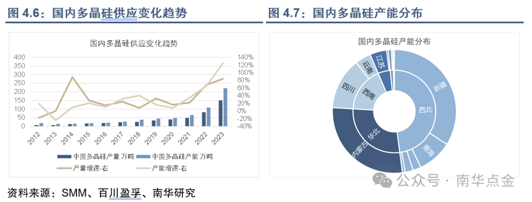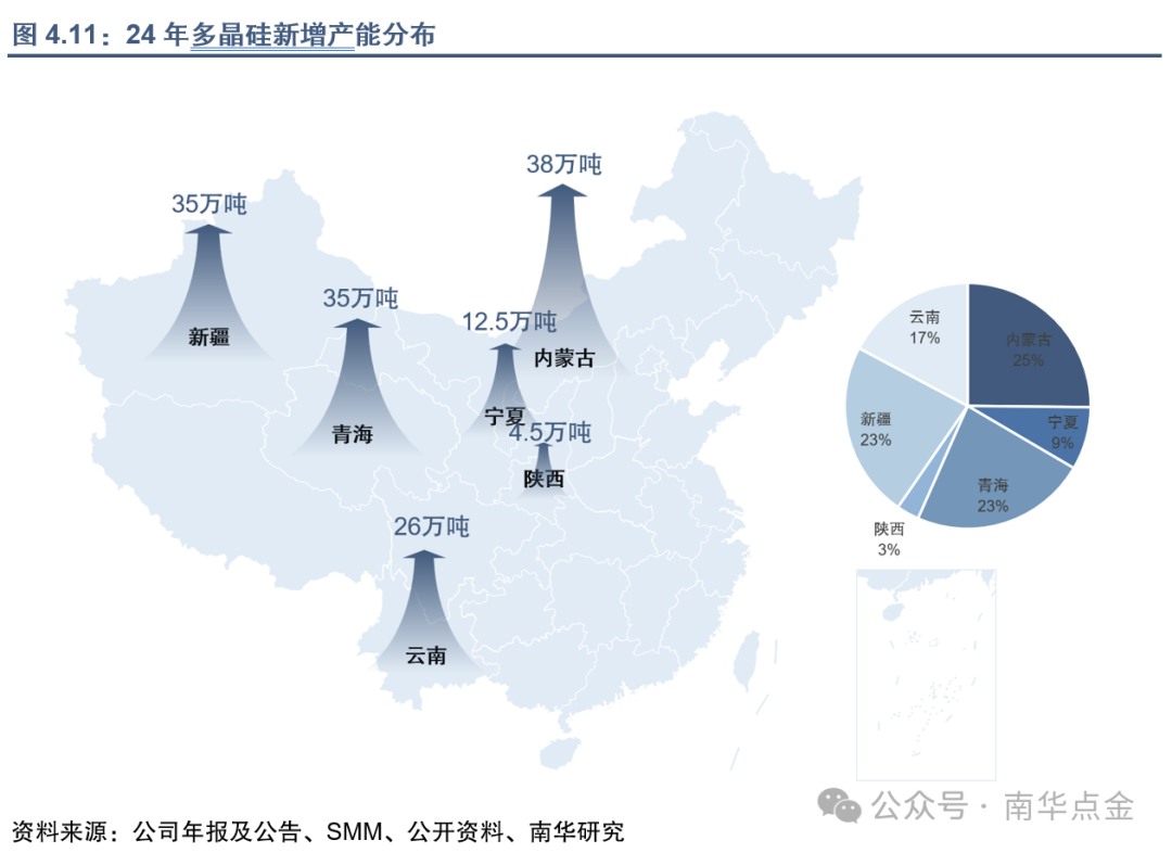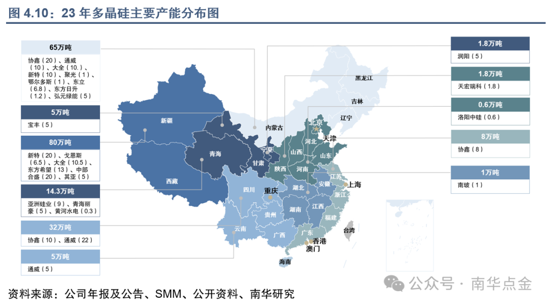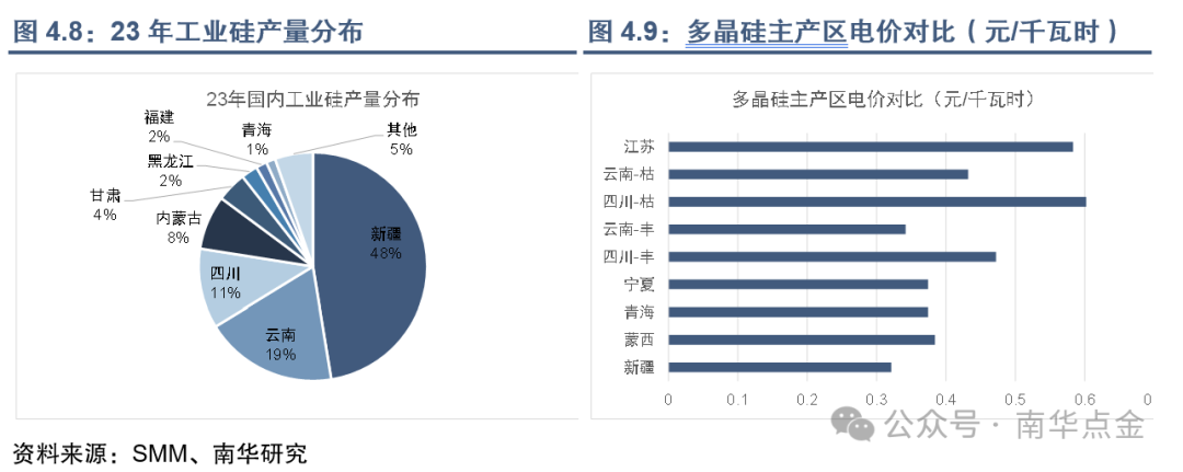 西北地区及内蒙主要优势在于原料供应的便利,以及与华东、西南地区相比更为稳定且低廉的电力价格。据SMM数据显示,2023年多晶硅原料——工业硅供应增量基本来自西北地区,从产量分布来看近半数工业硅产自新疆,新疆、内蒙、甘肃、青海四地供应占比达到60%以上。从主要产区的网电情况来看,西北地区平均电力销售价格基本可维持在0.4元/千瓦时以内,川滇两地面临枯水期干扰,江苏则完全不具备竞争优势(协鑫采用自备电)。预计随着风光大基地在西北地区逐步完成并网,未来西北电力资源优势将更加显著。