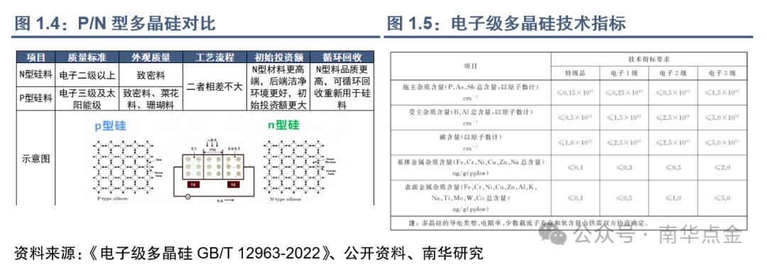 根据导电类型,多晶硅又可分N型和P型。N 型多晶硅以电子导电,其中掺杂以施主杂质(V族元素,如磷、砷、锑等) 为主;P 型多晶硅以空穴导电为主,其中掺杂以受主杂质(III族元素,如硼、铝、镓等) 为主。N型多晶硅品质较P型更高,少子寿命比P型高出1-2 个数量级;外观上达到复投料、致密料等级,普通P型上使用的菜花料无法满足N型投料要求;从国家标准来看,技术指标需满足电子级多晶硅2级以上的要求,现行国标太阳能特级多晶硅仅达到P型硅料的要求。