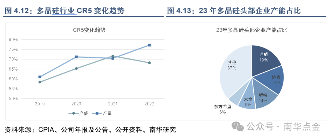 从竞争格局看,多晶硅行业集中度较高,且存在进一步向头部集中的趋势。产能CR5从2019年的58%提升到2022年的68%,产量CR5从2019年61%提升到2022年的77%。2022年以来由于全球光伏需求爆发,行业外企业跨界入局,行业内玩家纵向延伸,同环节竞争者加速扩张,多晶硅产能集中度因此受到一定影响。但龙头凭借更强的扩产能力、更低的电价、规模化优势、工艺积累、更强的口碑和更高的产品质量逐步强化行业寡头垄断地位,产量和出货量的市占率依旧维持领先地位。当前国内5家左右的一线企业格局较为明确,根据公开信息以及公司公告,截至2023年年末,通威、协鑫、新特、大全、东方希望产能分别约为42万吨、34万吨、30万吨、20.5万吨和13万吨,其中仅通威一家的产能市占率就达到近20%的水平。未来合盛的大规模投产可能会对行业前五格局造成冲击,不过从长期来看基于行业高投资门槛、高技术门槛、长投产周期特征,以及行业正在面临的价格下行、技术迭代考验,未来多晶硅行业大概率将继续维持高集中度格局。