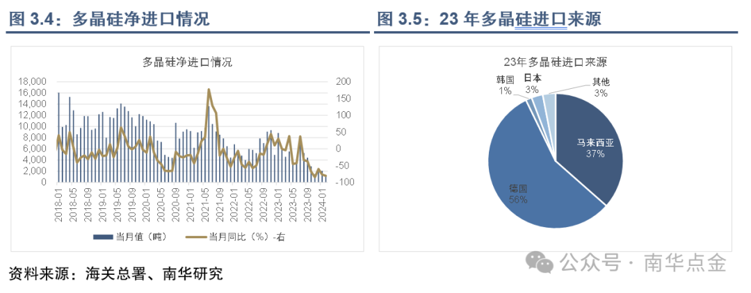 从贸易流向来看,全球多晶硅主要呈现由德、美等欧美国家向中、日、韩等亚洲国家净流入格局,马来西亚作为日韩巨头外设工厂地,亦形成向东亚国家出口的贸易流。于我国而言,当前仍需要进口多晶硅来对国内供应进行补充,不过进口体量已随着国内供应的迅速崛起而快速回落。据海关总署数据显示,2022年我国累计净进口多晶硅7.67万吨,同比下降26%,2023年累计净进口多晶硅5.45万吨,同比下降29%;2024年最新的月度净进口规模在1500吨附近,较2022年月均净进口6000余吨回落显著。从进口来源来看,我国多晶硅主要进口自德国与马来西亚,2023年我国从德国与马来西亚进口的多晶硅分别为3.54万吨和2.30万吨,分别占全年总进口量的56%和27%,基本是来自德国瓦克和OCI马来西亚的产品。