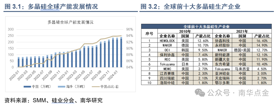 从全球范围看,海外多晶硅发展较早,多分布于欧美、日韩等发达国家,且核心技术掌握在几大寡头企业手中,集中度较高,我国多晶硅产业后来居上发展迅速,当前已占据全球主导地位。据SMM数据统计,截至2024年2月全球多晶硅产能约241.23万吨,其中海外产能14.4万吨,国内产能226.83万吨,占比达到94%。伴随着我国多晶硅整体产能的迅速增长,国内品牌在全球市场的地位和市场占有率大幅提升,2010年全球前十大多晶硅企业中我国仅有4家企业上榜,占全球产能的13.6%,且排名靠后,2021年全球前十大多晶硅企业中我国企业已达到8家,占全球产能的73.2%。