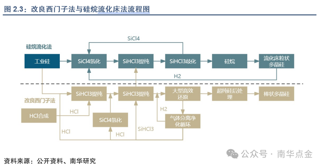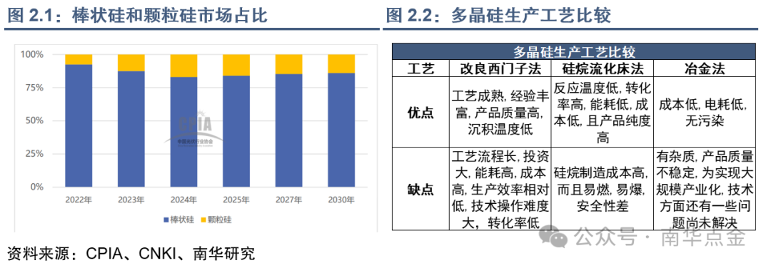 多晶硅生产工艺随着技术的迭代不断更新,当前常见的生产法分别为改良西门子法、硅烷流化床法、冶金法三种。三种工艺中,改良西门子法最为成熟,是当前国内外多晶硅主流生产工艺,据CPIA统计2023年由改良西门子法生产的棒状多晶硅在我国的市场占比在82.7%;硅烷流化床法凭借能耗、效率等优势逐渐占据一席之地,市场占比逐年提高;冶金法与其他方法最大的区别在于其为物理法,生产工艺也较为简单,但产品纯度低、转化率低等硬伤突出,因此较难进行工业化推广。