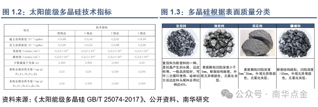 多晶硅行业当前现行的国家标准分为三种,分别为《太阳能级多晶硅 GB/T 25074-2017》、《电子级多晶硅GB/T 12963-2022》、《流化床法颗粒硅GB/T 35307-2023》,从不同维度对不同工艺、不同品级的多晶硅加以区分。太阳能级国标中,根据技术指标的差别从高到低分特级品、1级品、2级品、3级品,由于光伏行业近年来发展迅速,现行太阳能级多晶硅国标制定时间较早,其中标准较当前行业水平来说要求偏低,因此由七家行业龙头作为主要起草单位的新国标修订计划已于2023年12月1日下达,计划号20231109-T-469,预计项目周期16个月。此外,根据表面质量多晶硅可划分为致密料、菜花料、珊瑚料,三者品质依次降低。常见的还有复投料,复投料为致密料的一种,是拉晶产生的头尾、边皮料等,可作二次循环使用。单晶硅制备以复投料、致密料为主,少量参杂菜花料以节省成本。