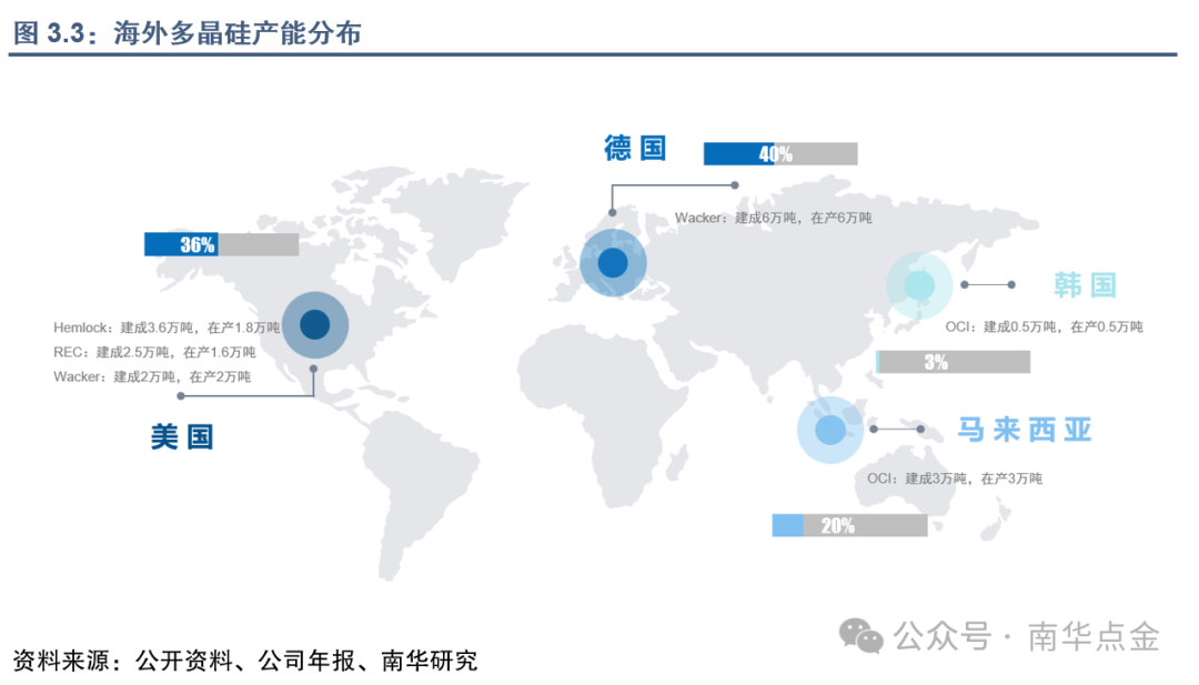 海外多晶硅生产萎缩的主要原因在于高成本、低售价带来的亏损压力,以及中国商务部自2014年起对产自美国、韩国的多晶硅实行的反倾销、反补贴制裁。不过随着2022年以来全球光伏需求爆发带动多晶硅价格摆脱低位,海外企业就中国产多晶硅面临涉疆问题做出应对,中国企业“走出去”向海外布局,海外多晶硅产能呈现缓慢增长趋势。