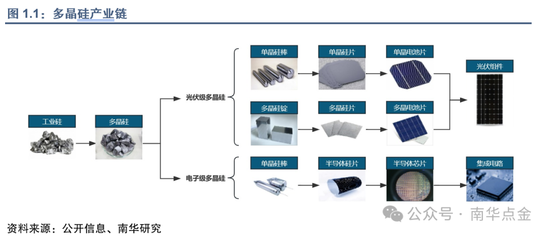 多晶硅与工业硅、单晶硅的主要成分都是硅单质,但又有所区别,主要体现在纯度与晶粒的排列顺序上。生产环节中,工业硅是生产多晶硅的原料,而多晶硅又是单晶硅生产的直接原料。工业硅的硅元素含量在98%及以上,不同牌号的工业硅铁、铝、钙等杂质含量各不相同。多晶硅可看作工业硅提纯后的产物,按照太阳能级与电子级不同的应用领域区分,硅纯度要求分别为6N-9N和9N以上(N表示9的个数,如6N为99.9999%)。多晶硅与其下游单晶硅的区别则主要在于晶体结构不同。多晶硅由许多小晶体组成,这些小晶体在生长过程中方向各异,而单晶硅则具有单一且连续的晶体结构。