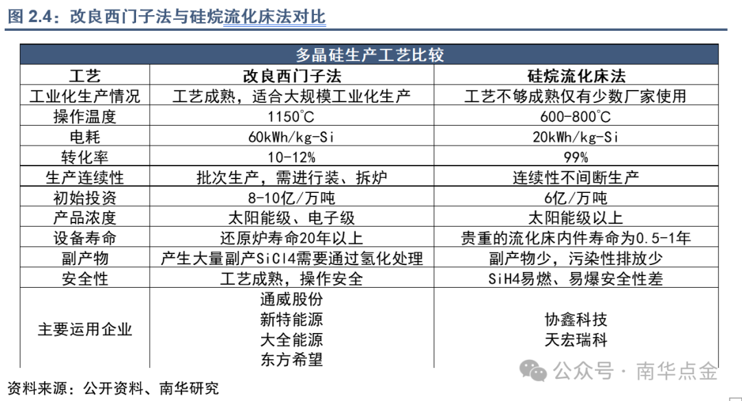 改良西门子法作为当前最主流的多晶硅制备技术,其工艺成熟稳定、适合规模化生产、操作安全的优势突出,目前通威、新特等国内多晶硅主流头部企业均以此法生产。不过硅烷流化床法以其低成本、低能耗、高转化率、可连续生产等优势在近几年获得市场的广泛关注。该技术目前量产企业较少,协鑫科技另辟蹊径专攻此赛道,2022年提出退出西门子棒状硅生产,2023年年底正式全面停产棒状硅,当前在颗粒硅领域已占据绝对主导及领先地位。此外,陕西有色通过与REC合资成立子公司天宏瑞科的方式获得技术转让,亦具备少量颗粒硅生产能力。根据相关企业公告,当前颗粒硅最为诟病的“氢跳”问题与纯度问题已基本解决,标志着流化床法的生产安全性和稳定性已得到显著提升,且完全可以满足N型时代需求。