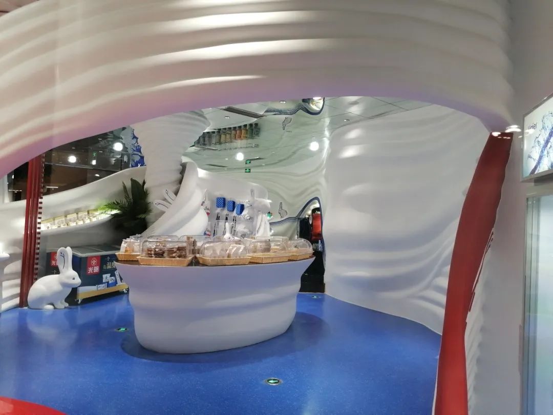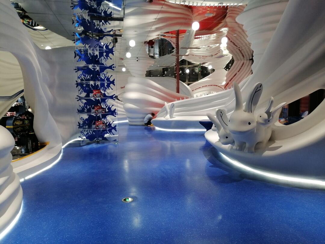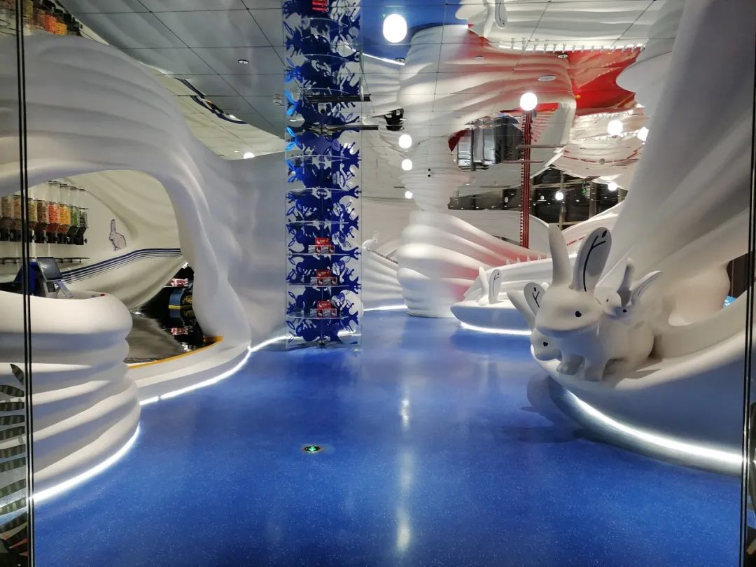“大白兔”全球首家IP形象品牌店落户上海奉贤新城九棵树未来艺术中心,全新产品琳琅满目,到处都充满着大白兔奶糖的元素,童年记忆里的奶糖元素搭配环氧磨石艺术地坪,使得整体无缝地坪的实用性和艺术观赏性得到了完美结合,加深了视觉冲击力与品牌印象。