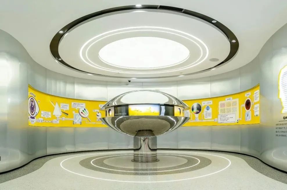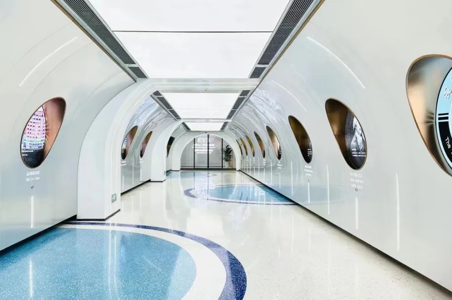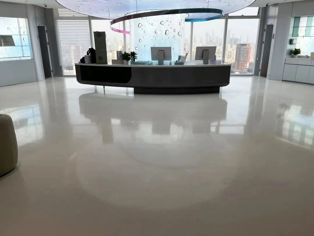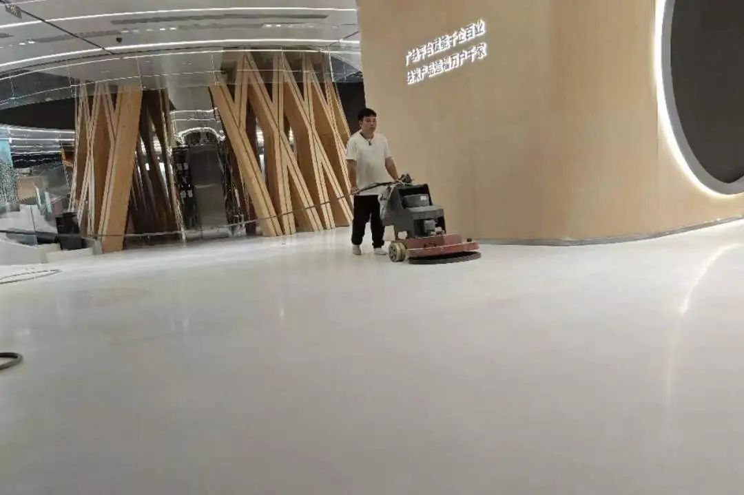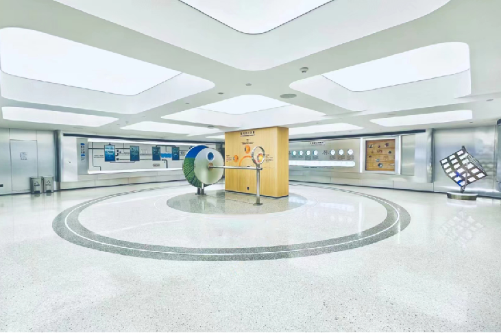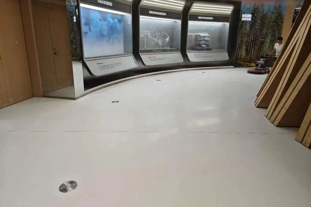 整个科技馆主要采用白色和灰色为主色调的环氧磨石来装饰展馆地面。宏伟大气的大圆形环氧磨石地面设计将地面与墙面的搭配过渡自然、衔接无痕。