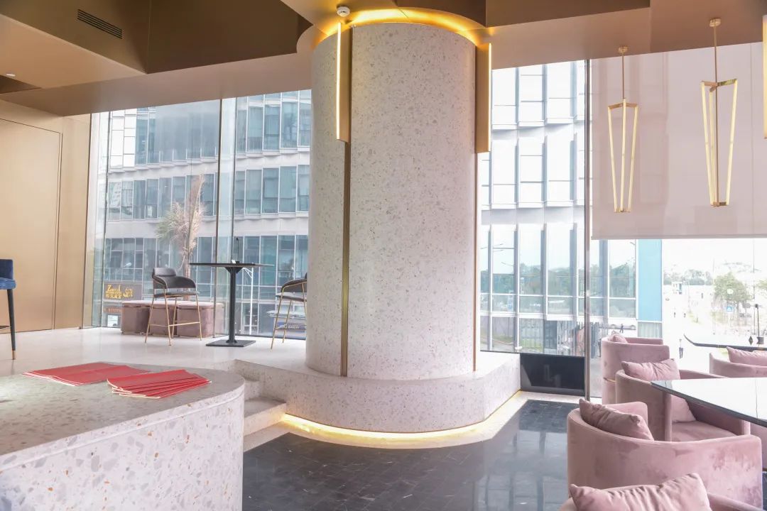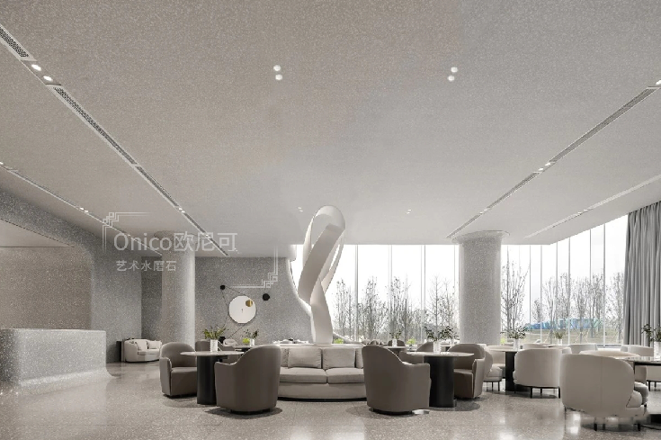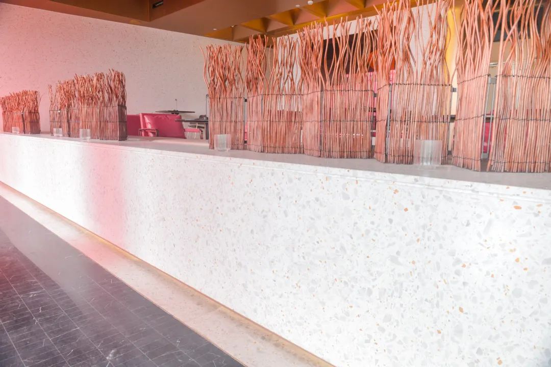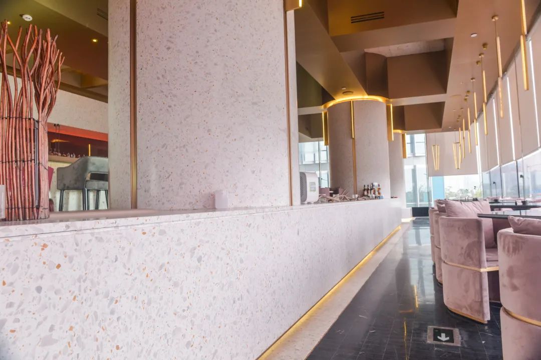 Wann Lounge坐落于深圳湾一号商业区域,号称深圳“最多元”的餐吧,既是餐厅,也是酒吧。使用了精心设计的欧尼可水磨石样式,水磨石吧台,地面、墙面以及凸显设计感的水磨石圆柱,让Lounge空间尽显高级感。