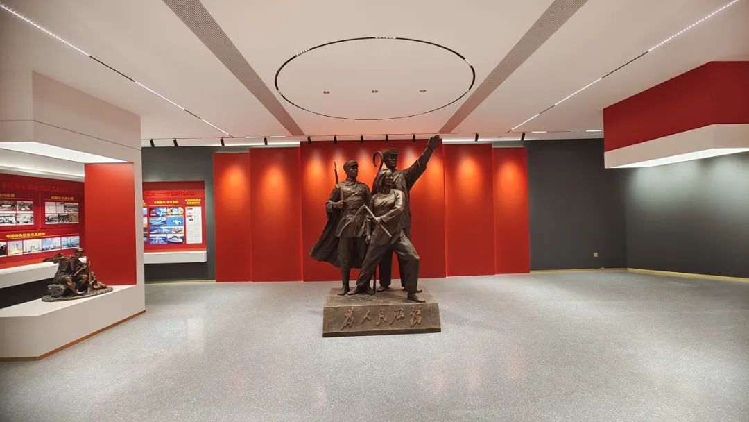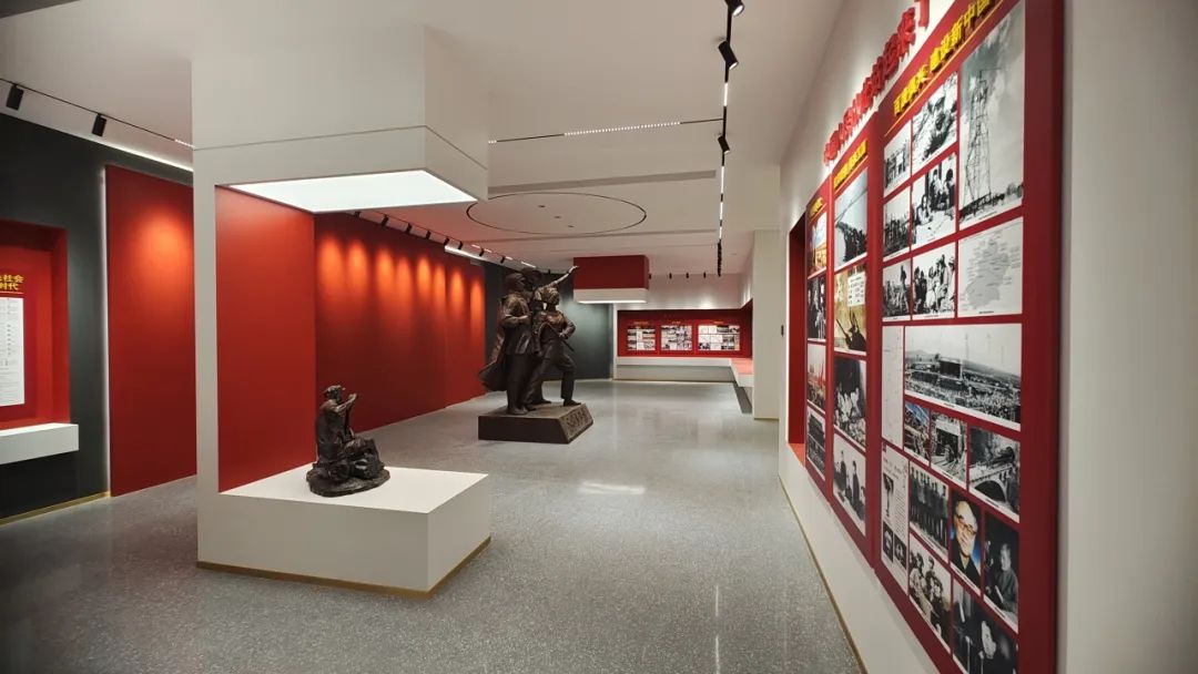 福清党史博物馆,作为刚刚落成的红色新地标,不仅在设计上处处都体现了党的元素,材料的选择也都别具匠心,其红色的主基调与灰色的水磨石地面相映成辉,中国结地面造型将红色精神与传统文化相结合,完美承载了空间的意义。
