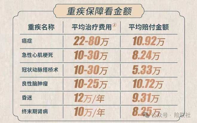 新华人寿在理赔报告中提到,癌症在重疾出险中占比高达74.07%,平均治疗费用为22万-80万之间,但癌症的平均赔付金额仅为10.92万元;同时,急性心肌梗死、冠状动脉搭桥术也是常见的重疾出险原因,平均治疗费用均在10万-30万之间,但平均赔付金额仅为8.24万元和5.33万元。