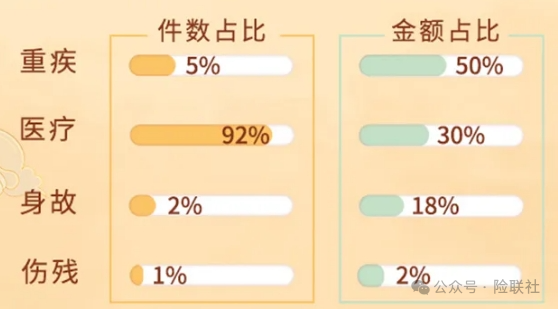 例如,平安人寿医疗赔付件数占比92%,但金额占比仅30%;重疾赔付件数占比5%,金额占比却高达50%。