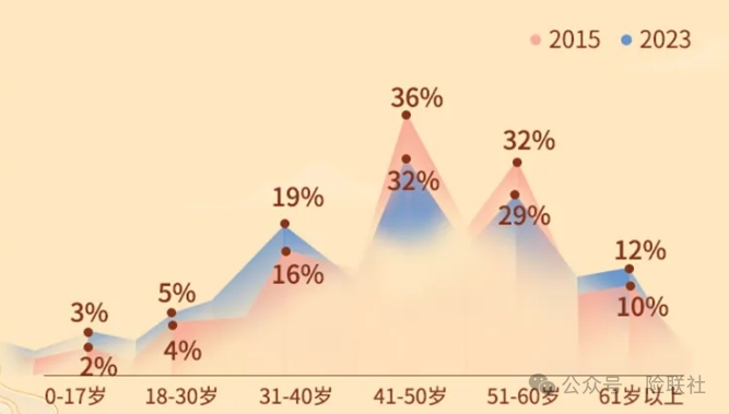 平安人寿也在2023年理赔报告中提到,从2015年到2023年,重疾年轻化趋势明显,0-17岁、18-30岁、31-40岁三个年龄段重疾发病率分别为3%、5%、19%,均高出2015年的同龄段发病率统计,即越来越多的年轻人面临重疾风险,值得大家高度关注。