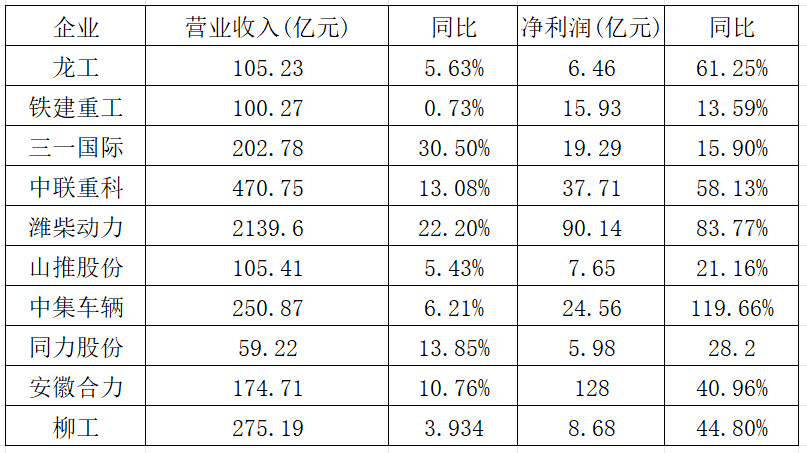 据不完全统计,国内也已有10余家工程机械企业相继派发“成绩单”。