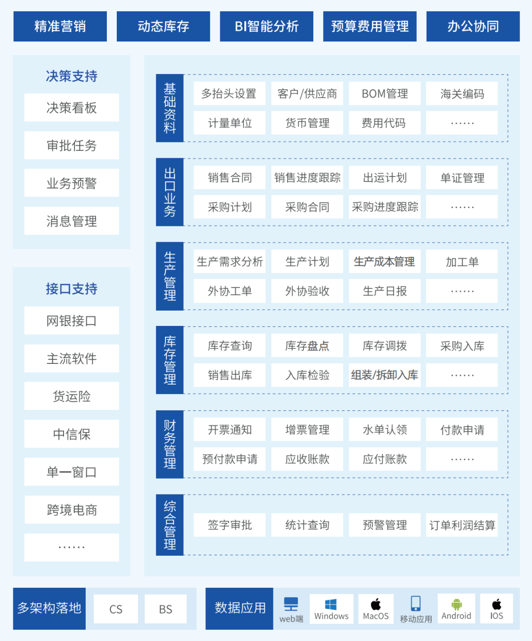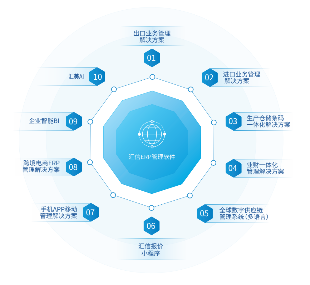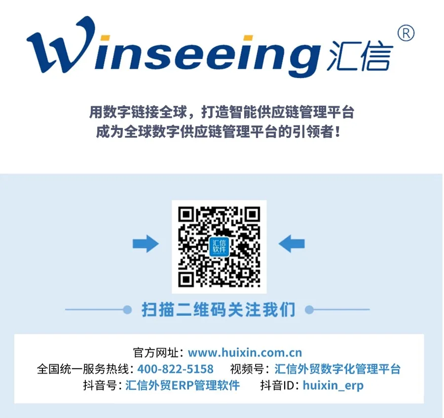 『汇信软件』产品涵盖出口ERP、进口ERP、生产仓储ERP、外贸供应链管理、业财一体化、手机APP、跨境电商、企业门户等,帮助企业进行全方位、全流程、全链条数字化赋能。
