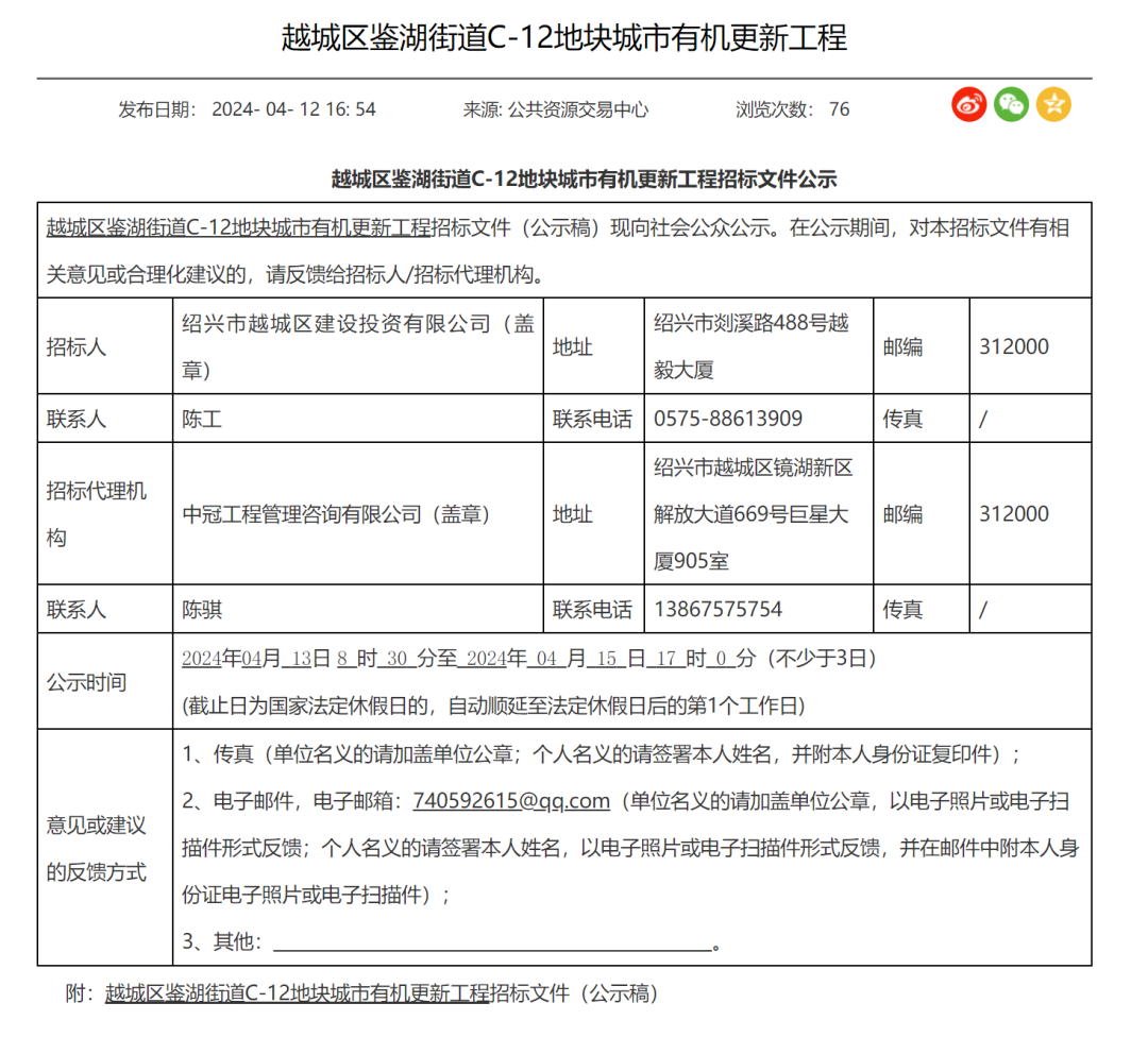 近日,越城区人民政府网站发布了越城区鉴湖街道C-12地块城市有机更新工程招标文件公示。