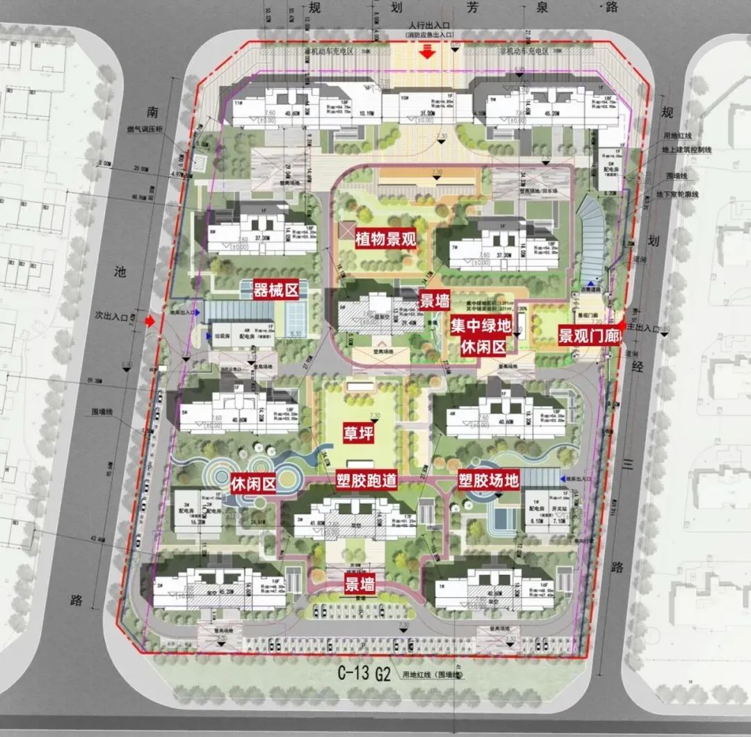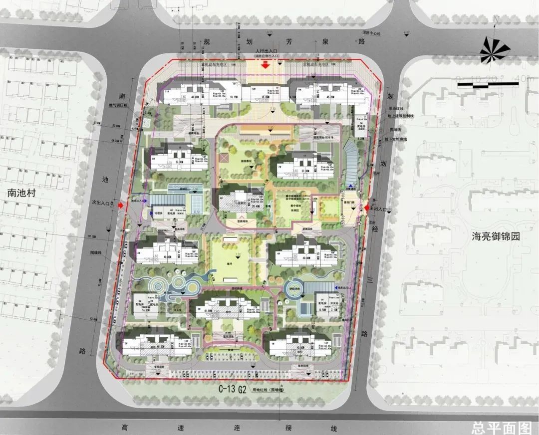 根据规划效果图显示,该区块拟建10幢16F-18F的高层住宅建筑。主出入口位于规划经三路,与海量御锦园一路之隔;次出入口位于南池路;人行出入口位于规划芳泉路。