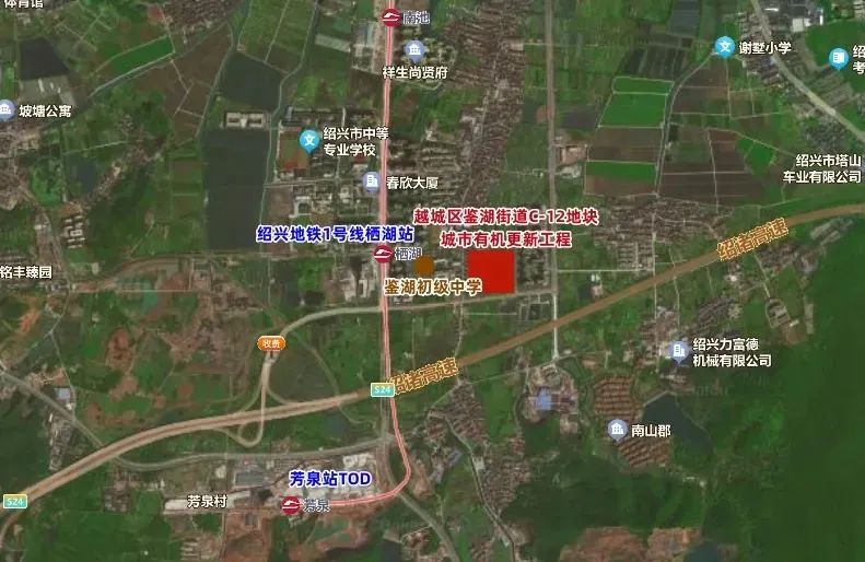 项目西侧则是鉴湖初级中学,距离绍兴地铁1号线栖湖站约500多米(来源百度测距),距离在建中的芳泉站TOD也非常近。