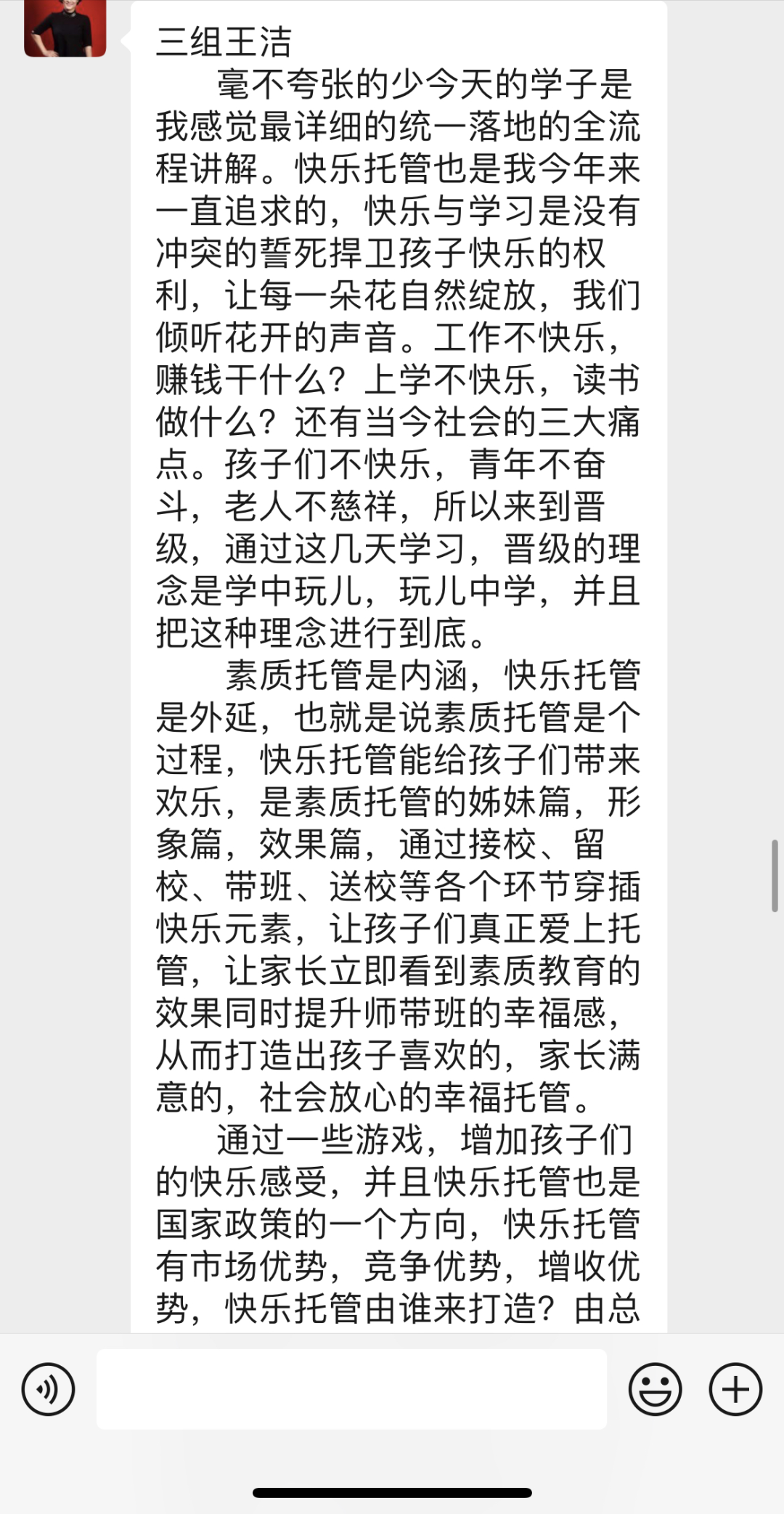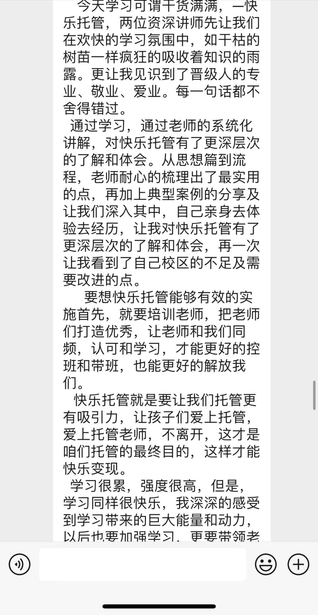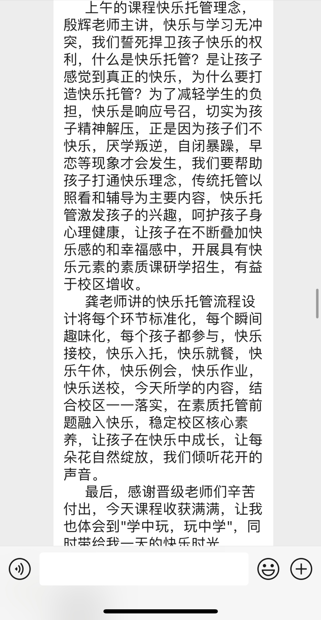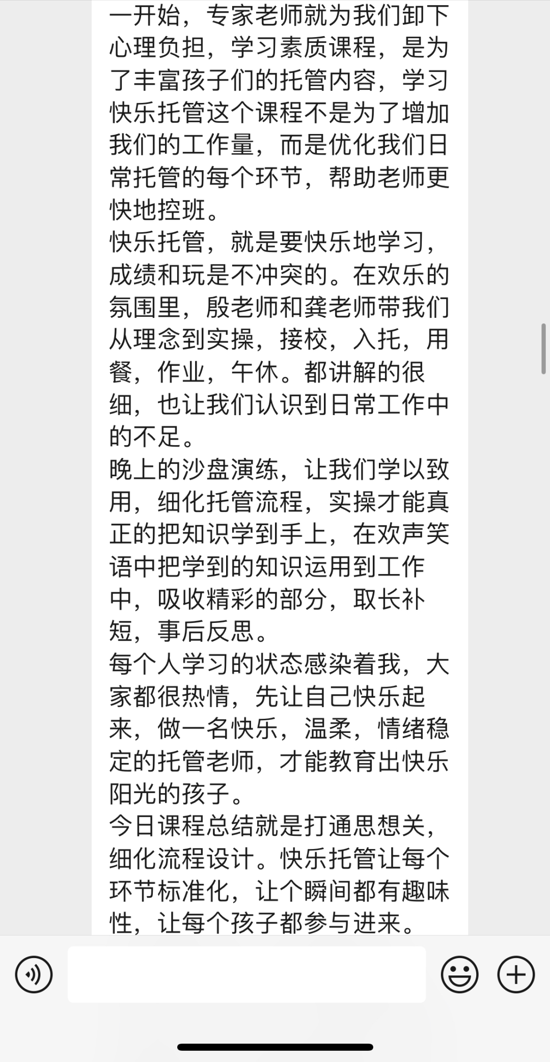 为期两天的快乐托管内训会课程主要包含:快乐托管理念、流程设计、每月每周每学期安排、宣传技巧以及落地方法等干货内容,把所有看不见的地方,都用体现快乐元素的标准化的流程去覆盖,很大程度上减少管理成本,增加安全系数!有利于校区快速复制,让管理更加便捷!