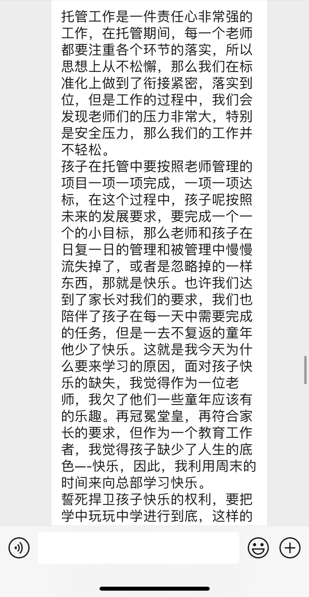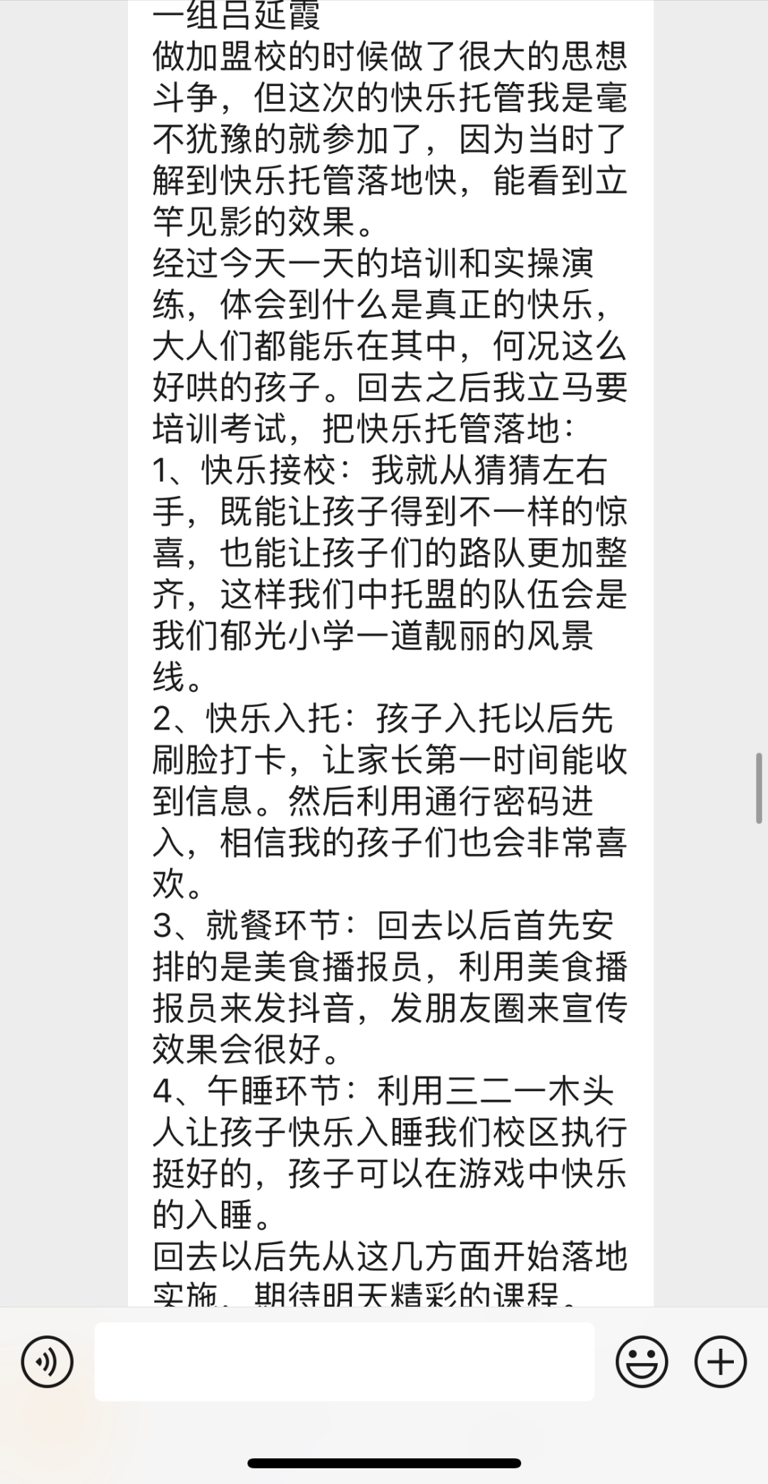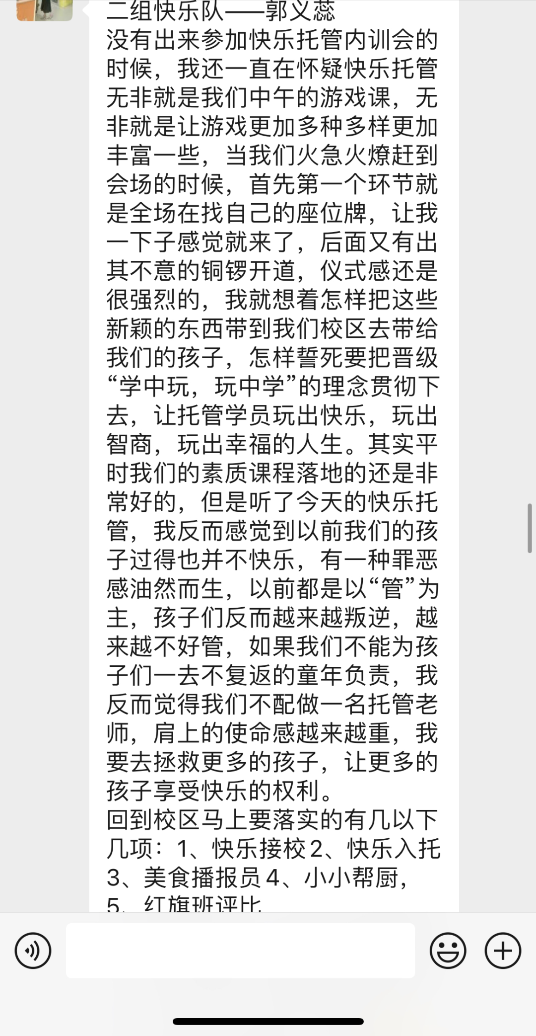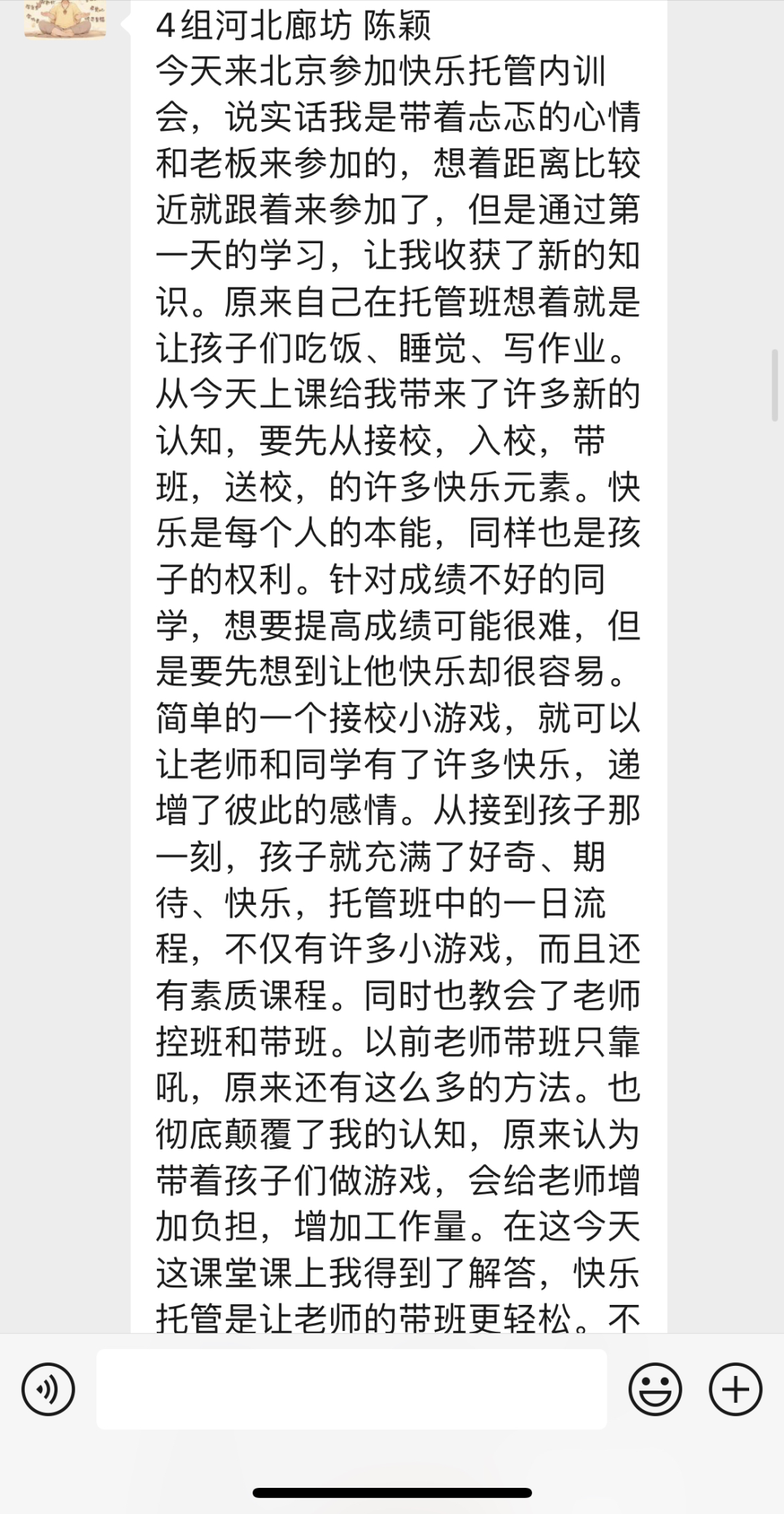为期两天的快乐托管内训会课程主要包含:快乐托管理念、流程设计、每月每周每学期安排、宣传技巧以及落地方法等干货内容,把所有看不见的地方,都用体现快乐元素的标准化的流程去覆盖,很大程度上减少管理成本,增加安全系数!有利于校区快速复制,让管理更加便捷!