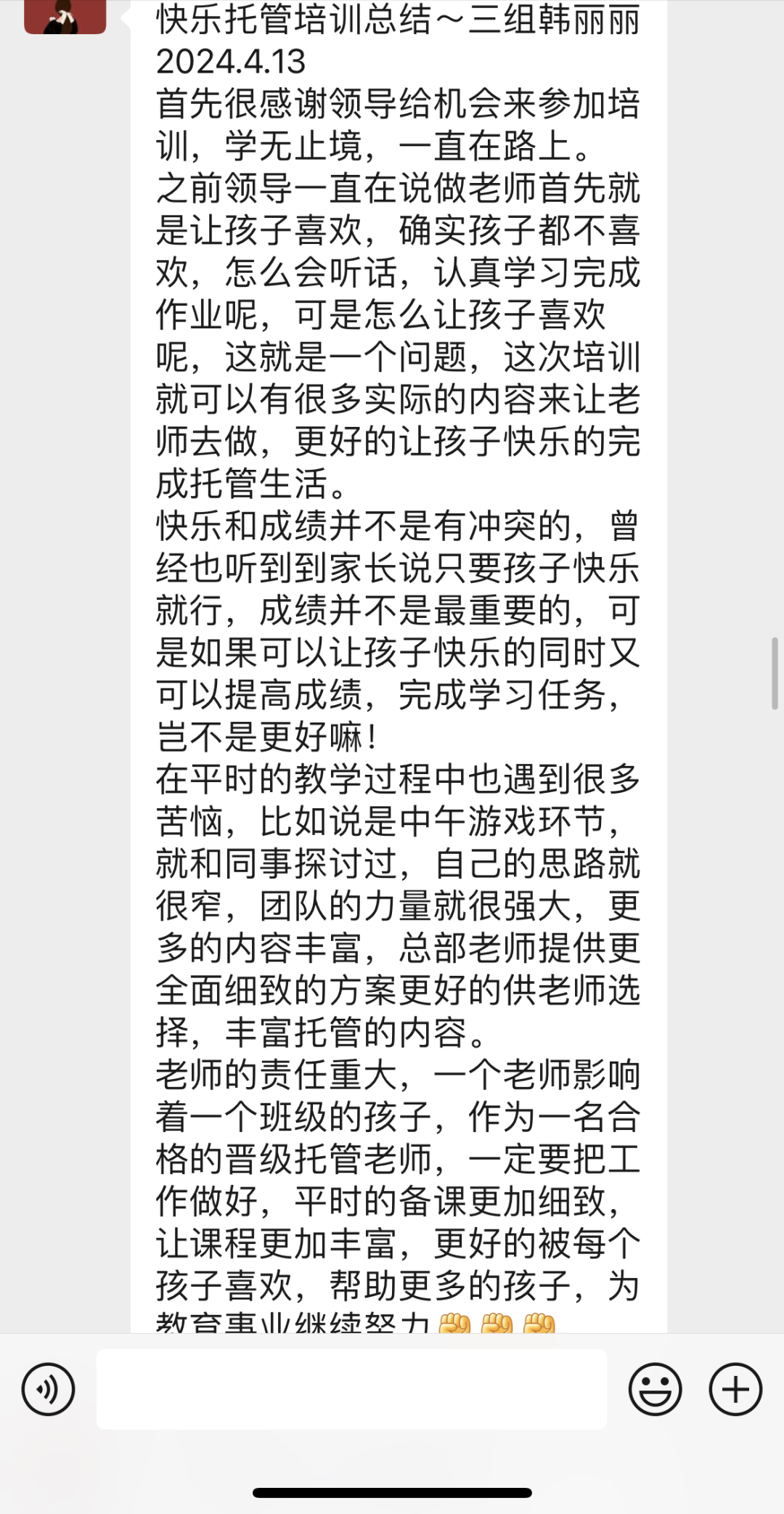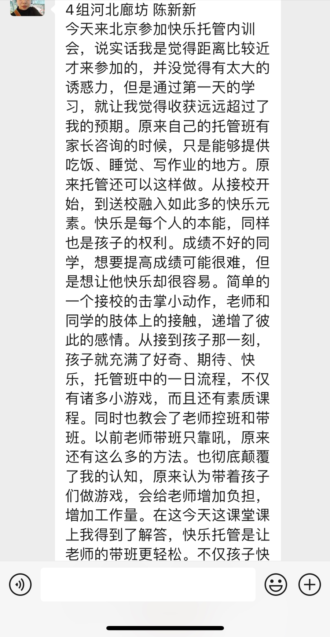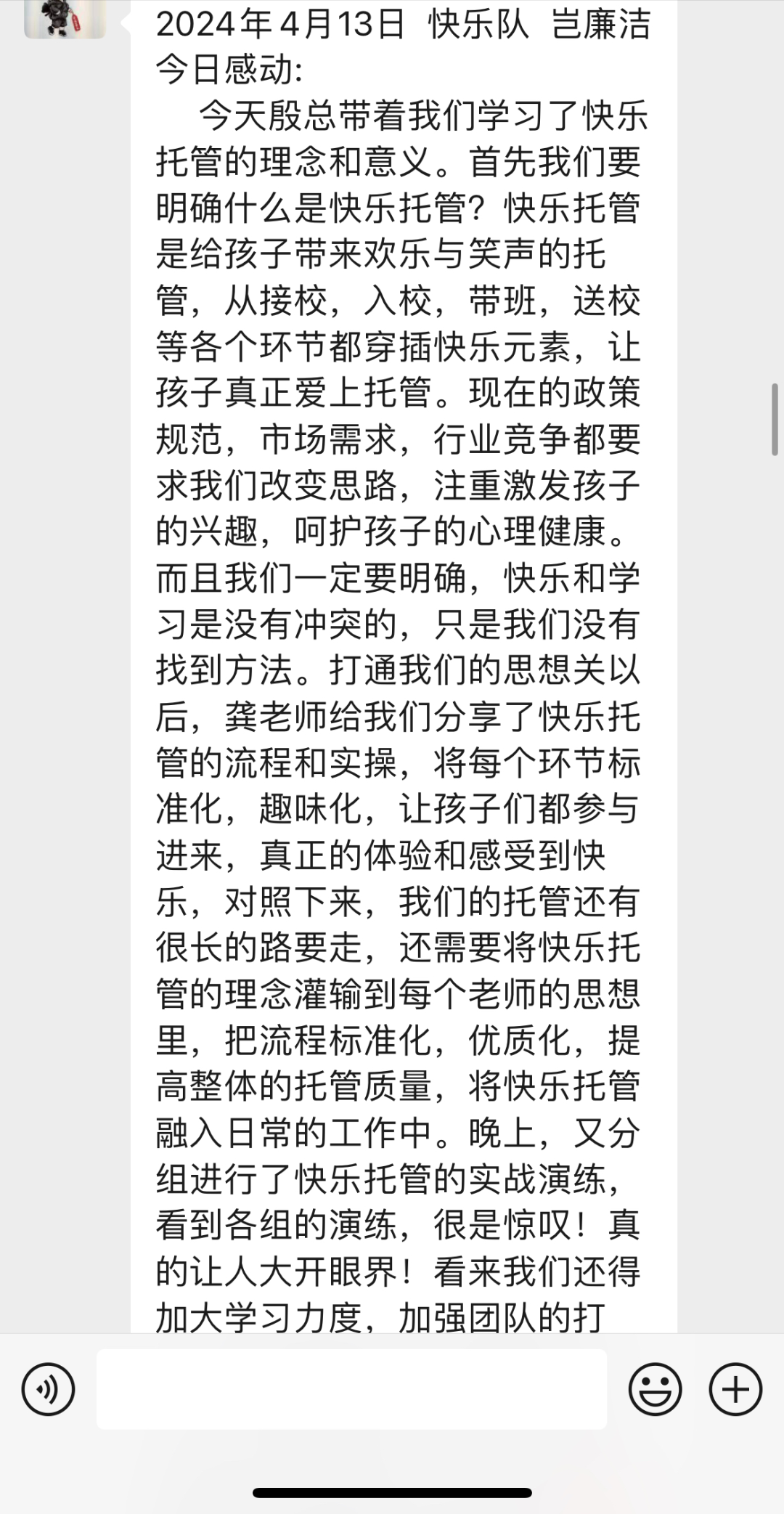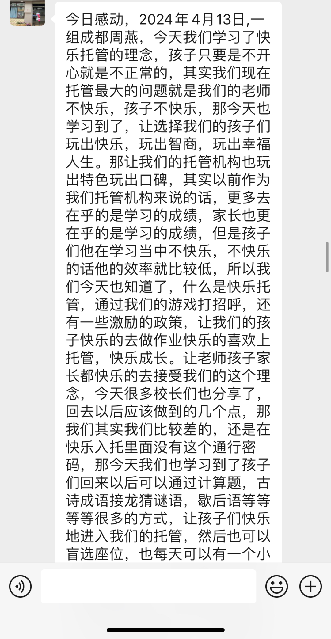 2024年4月13日-14日,品牌托管新模式之快乐托管内训会在北京圆满收官,来自全国各地的晋级加盟校长和老师齐聚一堂,学习如果打造快乐托管,从接校、入校、带班、送校等各个环节穿插快乐元素,让孩子真正爱上托管,让家长立即看到素质教育的效果,同时提升老师带班的幸福感,从而打造出孩子喜欢、家长满意、社会放心的幸福托管。