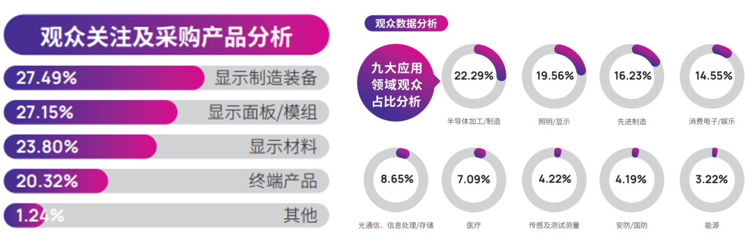 随着应用端对显示技术提出了越来越高的要求,新兴显示技术也在竞相发展,整个显示产业链、供应链,以及材料和设备国产化的需求日益加大。本次展会展现显示制造装备、材料、面板/模组之间从材料研究到产品制造的完整显示技术生态系统。本次展会将展出显示制造装备,提供从微观制造工艺到宏观生产线的全方位解析。包括:曝光设备、物理气相沉积装备、化学气相沉积装备、蚀刻设备、喷墨打印设备、涂胶设备、蒸镀设备、激光设备、巨量转移设备、固化设备、剥离设备、切割设备、洁净设备、贴合设备、缺陷检测设备、缺陷修复设备、磨边机、固化设备、视觉检测设备、清洗机等。显示材料作为显示技术的血液,其性能直接影响到显示效果的质量与应用的广泛性。展会将展示各类高性能材料,包括但不限于靶材、OLED材料、量子点、Mini/Micro LED芯片、驱动IC、PCB、FPC、玻璃基板、盖板玻璃、液晶材料、ITO玻璃、偏光片、彩色滤光片、胶粘产品、掩模版、防静电材料、电泳材料、光波导材料、光刻胶、显影液、电极材料等,这些材料的革新为显示技术的未来发展打开了新的可能性。部分材料及装备的代表企业有宁波天璇新材料、视彩(上海)光电、壹倍科技、涌创兴盛、良希光电、托托科技、速德瑞、奥来德光电等。除开显示制造装备与显示材料的展示,本次展会还将重点展示显示面板/模组,参展的显示屏和模组将涵盖从传统的LCD、LED到最新的OLED、Micro-LED等多种类型,以及 3D显示技术应用方案、COB模组、RGB封装、背光源组件等。部分代表展商有冠显光电、天璇新材料、睿显科技、视彩(上海)光电、浙江宏禧、镭昱光电、熙泰智能、壹倍科技、芯视元电子、赛富乐斯半导体、涌创兴盛、良希光电、托托科技、速德瑞、思坦科技、长星半导体、庞纳微半导体、臻像科技、希盟精密流体、奥来德、视涯科技、季华实验室、睿显熙电子等。随着Mini/Micro-LED等新型显示快速增长。其下游应用也将持续推动行业不断发展,其中显示屏幕是 VR/AR 头显的核心元器件之一。CIOE中国光博会还将重点展示AR光波导组件,成像系统,AR显示模组,衍射光栅,动作捕捉设备,声音感知设备,头盔,眼镜,一体机,交互设备,VR+应用场景等一系列的产品展示,部分参展企业有:歌尔光学、上海首镜 、理湃、 灵犀微光 、谷东科技 、珑璟光电 、耐德佳 、光舵科技 、富兰光学 、珠海莫界、 上海显耀 、鲲游 、天仁微纳、至格科技、 邑文科技 、仙瞬、 S-Dream Lab 、广纳四维 、奥提赞光晶 、爱普生、 水晶光电 、欧菲光、 辰瑞光学 、千宇 、惠牛、 Dispelix 、美题隆、 昇旸 、三奕电子 、新维度等。随着新型显示技术在半导体、照明、手机、AR/VR、智能汽车、先进制造、医疗等应用领域的广泛应用,CIOE新型显示技术展聚集了各大应用领域的专业观众。这些专业观众群体包括企业高层管理者、采购决策者、产品设计师、研发工程师、生产线管理者以及质量控制人员等,完全覆盖了显示技术产业链的各个环节。以下为优质的精准专业买家: