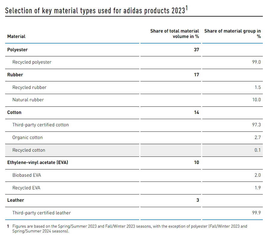 Selection of main material types for Adidas 2023 products