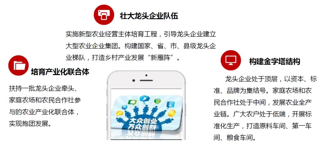 发挥龙头企业在开拓市场、品牌营销等方面的优势。发挥农民合作社在生产组织、农资采购、技术指导等方面的优势,支持发展订单农业。发挥家庭农场、农户在家庭经营生产方面的优势,支持其参与组织化生产。推动各类新型农业经营主体融合发展,形成差异化竞争、功能互补的良好格局。
