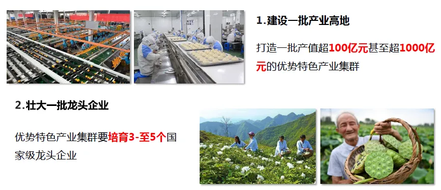 支持建成一批年产值超过100亿元的优势特色产业集群,推动产业形态由“小特产”升级为“大产业”,空间布局由“平面分布”转型为“集群发展”,主体关系由“同质竞争”转变为“合作共赢”,形成结构合理、链条完整的优势特色产业集群,使之成为实施乡村振兴的新支撑、农业转型发展的新亮点和产业融合发展的新载体。
