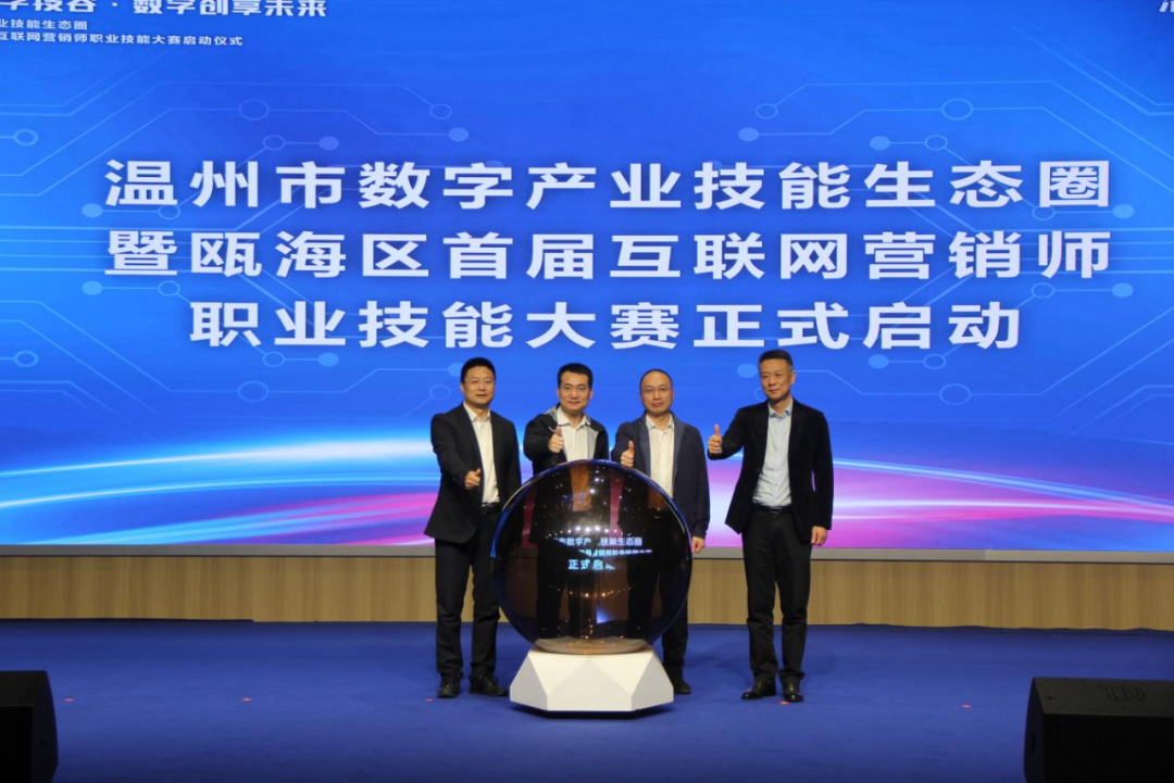 4月14日,温州市数字产业技能生态圈建设暨瓯海区首届互联网营销师职业技能大赛启动。温州市人力社保局党组书记、局长张雷,瓯海区副区长杜潘祚,温州技师学院校长刘杰,浙江安防职业技术学院党委委员温剑峰出席活动,瓯海区各职能部门负责人、电商直播基地代表、职业技能培训机构等80余人参加活动。
