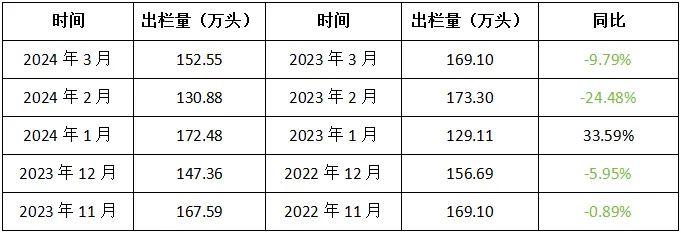 最新的3月份数据,今年出栏量是152.55万头,而去年是169.10万头,同比减少了9.79%。