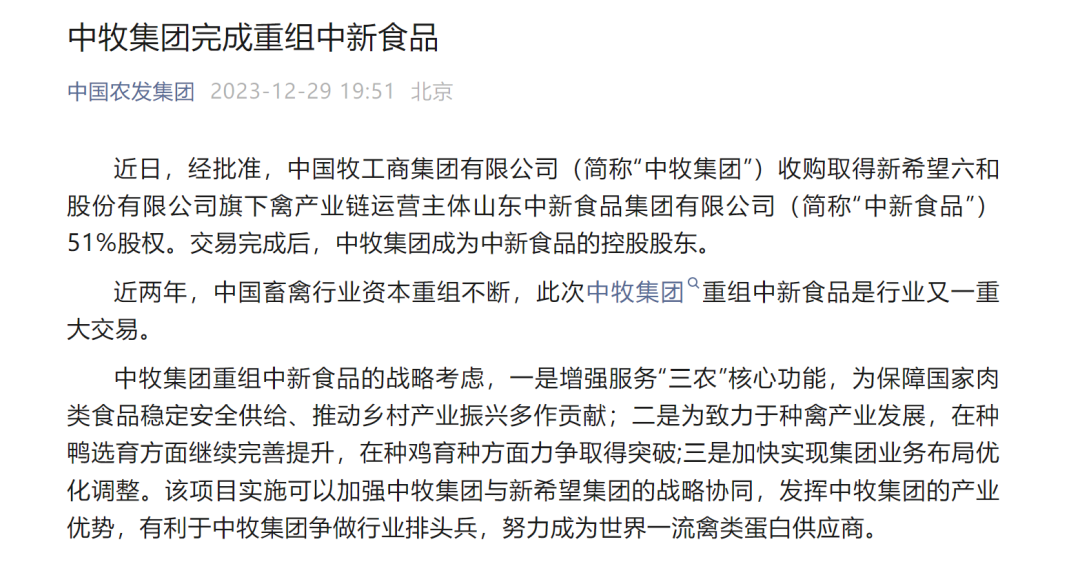 2023年12月,中牧集团拟通过现金方式取得公司旗下禽产业链运营主体,即子公司山东中新食品集团有限公司(以下简称“中新食品”)的51%股权,本次交易价格合计27亿元,交易后,中牧集团成为中新食品的控股股东。