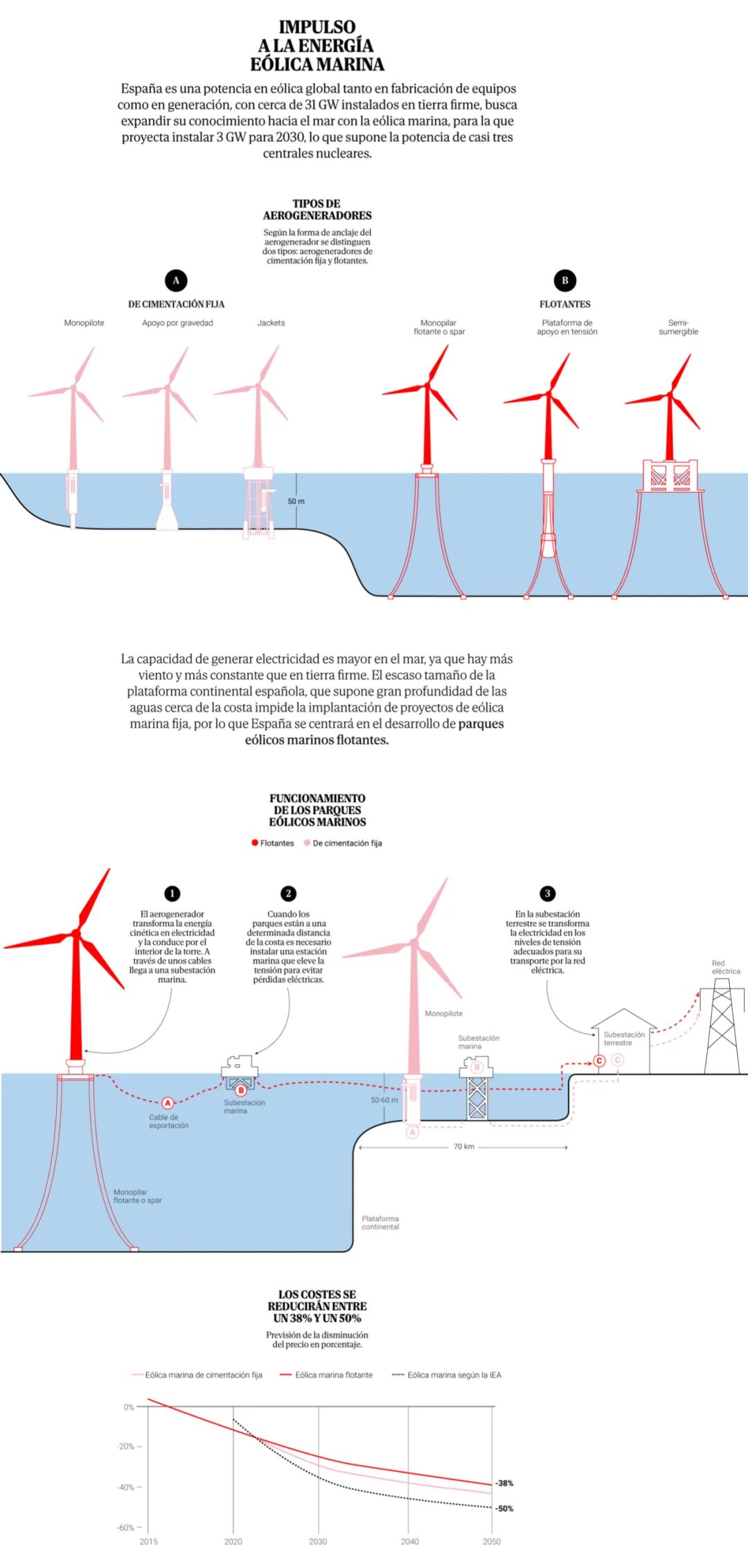 过了刮风季,特别是到了炎热的夏天,伊比利亚半岛上的风电供应就会受影响,但随着科技的进步,已经有了替代方案——人们把风力发电机树立在位于海面的浮动平台上,进而获得海上风能(Energia eólica marina)。