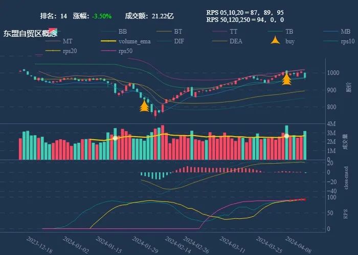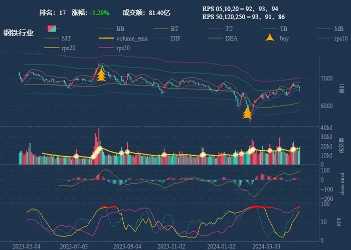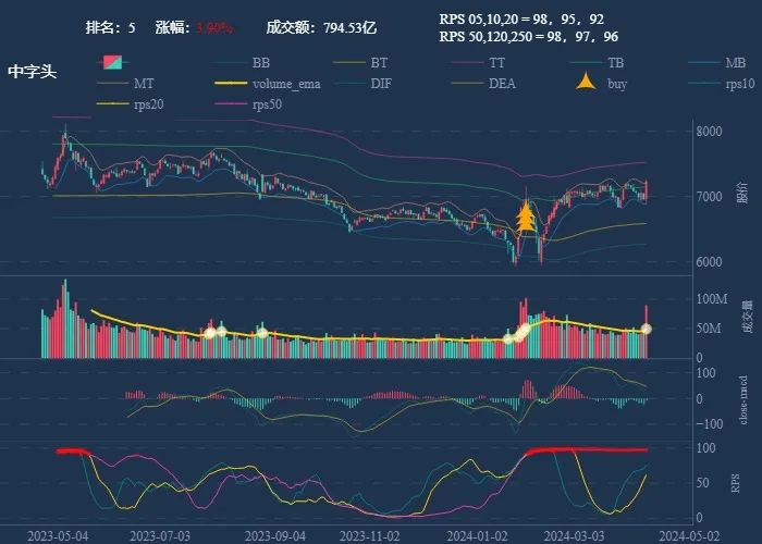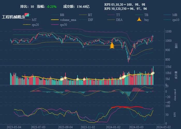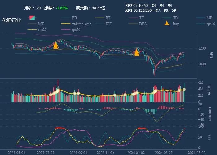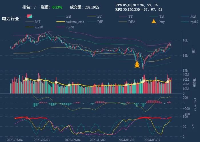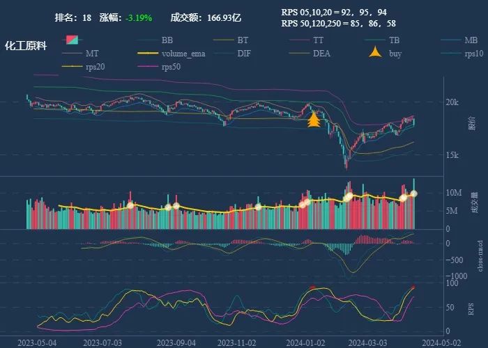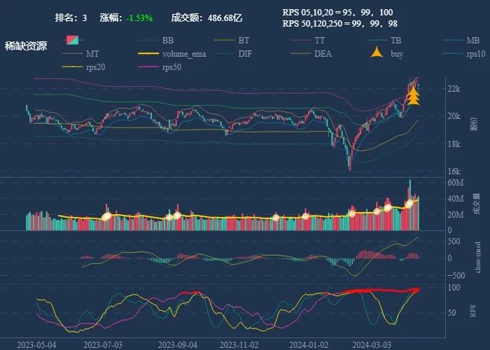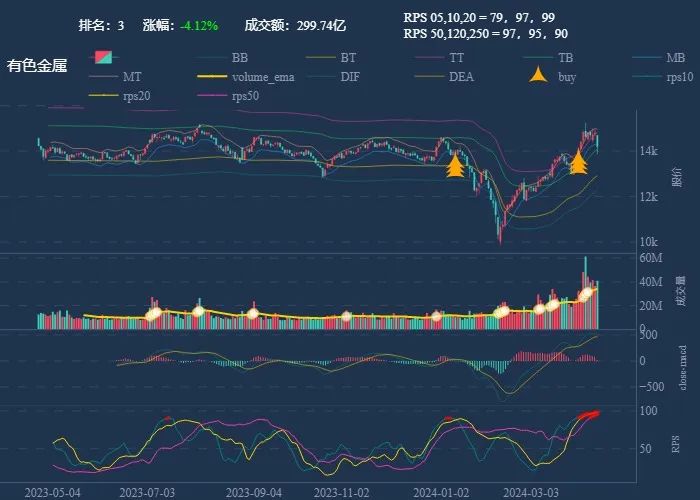 成交额超过 100 亿 排名靠前,macd柱由绿转红 成交量要大于均线 有必要给每个行业加一个上级的归类,这样更能体现主流方向 rps 有时候比较滞后,但不少是欲杨先抑, 应该持续跟踪,等 macd 反转时参与 一线红:第一次买点出现后往往是顶峰,等回调,macd 反转,rps50 还一直红,第二次买点重现 行业趋势依旧在,做最强个股,别恐高。 第一波行情 rps20 + 10日均线,第二波行情 rps50 + macd反转。
