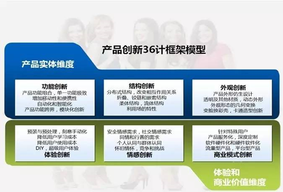 我们的创新教练通过对当前大量的优秀案例,包括国内外各种创业大赛的优秀创业项目、国内外电商平台的爆款产品、众筹平台和创意网站上的高人气产品创意,进行收集、分析、总结和归纳,了解这些优秀产品之所以获得市场成功和用户喜爱的原因,并对这些要素进行归类和提炼,最终揭开了优秀产品成功的秘诀。这些秘诀可以总结成2个方面、6个维度、36个成功要素。2个方面是指产品创新包括产品硬件实体本身的创新以及产品所承载的软性商业价值方面的创新;6个维度是指产品创新可以从6个维度进行思考,分别是产品功能创新、产品内部结构创新、产品外观形态创新、用户体验创新、用户情感需求创新、产品商业模式创新。为了保证创新方法的可操作性,在这6个创新维度下,每个维度都可以再细分为6个创新思考点,这样整个产品创新体系就形成了36个具体的创新思考点,也就是36种具体的创新方法。为了方便理解、记忆和传播,我们将这套产品创新方法总结为产品创新36计,并最终形成这套培训课程。