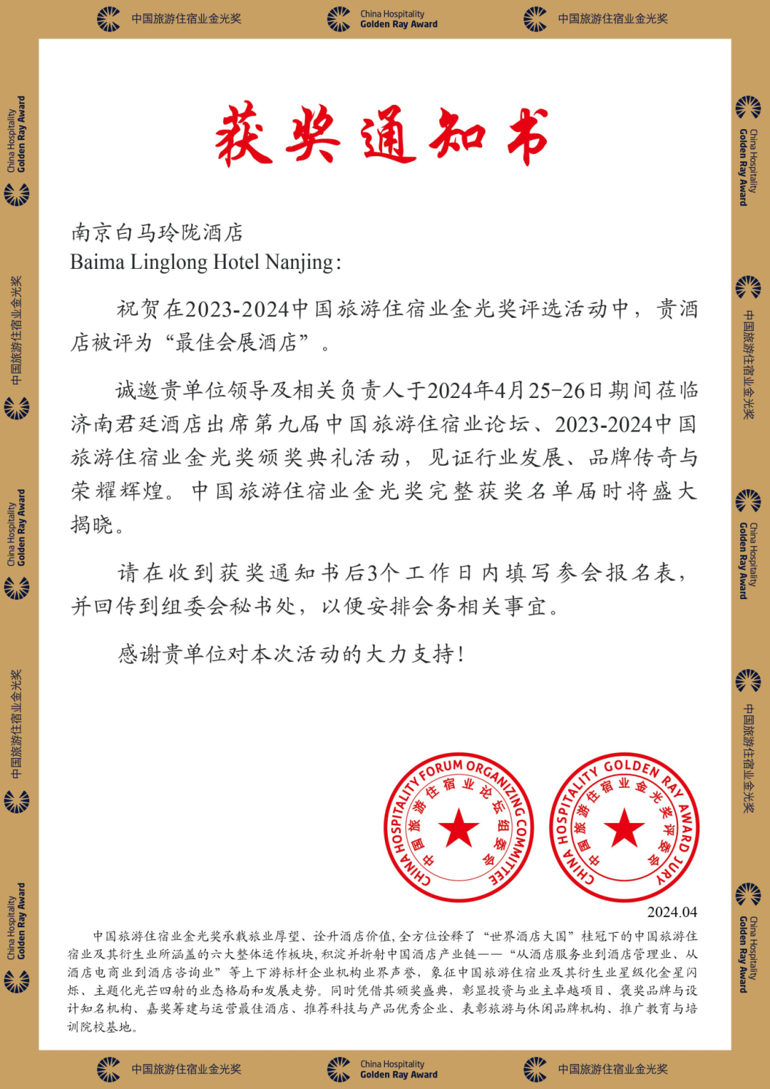 “最佳会展酒店奖”的获得,既是对南京白马玲陇酒店与博览中心融合成果的肯定,也是对业内发展多元化酒店类型的期待。南京白马玲陇酒店将坚守创新,在农高集团的指导方针下继续发挥自身的品牌优势、服务优势,不断拓宽酒店、会展的业务范围,放大会展“城市之窗”的成果。