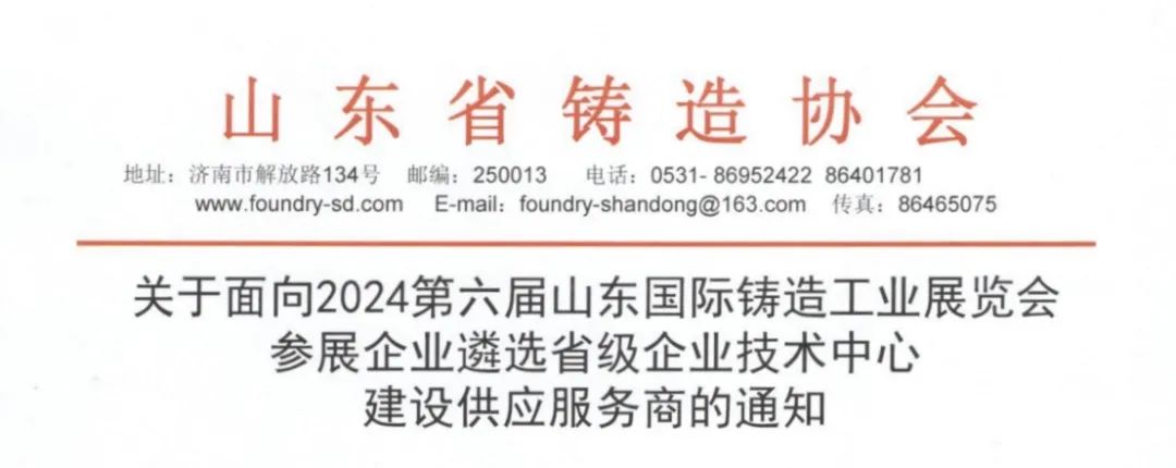 按照山东省铸造协会积极推动全省新质生产力发展下的铸造行业高质量发展及铸造产业技术和创新能力提高的进步精神,经山东省铸造协会和旭光省级企业技术中心研究决定,定于4月26日上午10:00在青岛西海岸新区世界博览城协会展区(S1馆CT05)召开“山东旭光省级企业技术中心”服务商遴选会议,有关事宜公告如下: