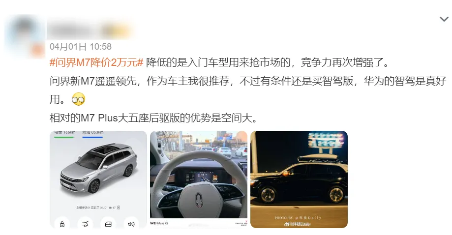 4月1日,也就是SU7发布后的第4天,“问界新M7入门型”直接降价2万元,调整到22.98万元。