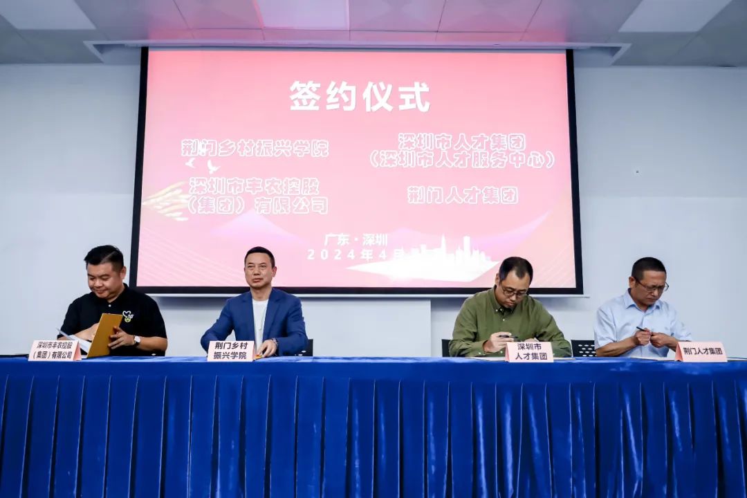 ❖2024年荆门市“强产聚人”人才工作能力提升培训班培训成果汇报暨双招双引签约仪式在深圳举行,荆门乡村振兴学校与深圳市丰农控股(集团)有限公司签订战略合作协议。