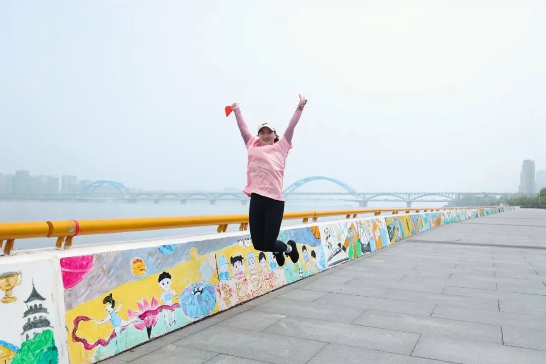 江水滔滔,波光粼粼,江对岸的六和塔、钱塘江大桥上飞驰而过的列车、江堤墙面上的手绘画、波光粼粼的钱塘江水、最美跑道上的落樱缤纷、不远处雄伟的复兴大桥,大家纷纷合影留念。