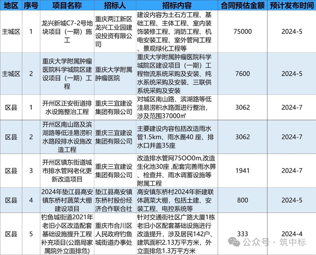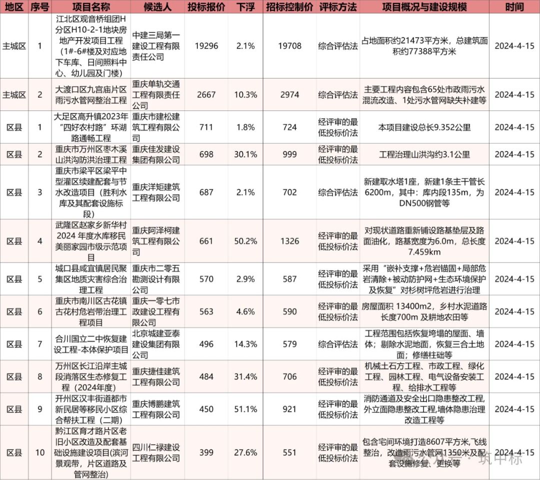 今天是2024年4月16日,下面是最新的工程建设类招标计划简讯,招标计划全市总计7条,主城区2条,周边区县5条。项目合同预估金额大于1亿的有1个,主城区1个,区县0个。1000万-1亿的有4个,主城区1个,区县3个。下面是最新的工程建设类招标公告简讯,招标公告信息全市总计7条,主城区3条,周边区县4条。项目合同预估金额大于1亿的有0个,主城区0个,区县0个。1000万-1亿的有5个,主城区2个,区县3个。其中采用“综合评估法”的项目有4个,采用“经评审的最低价投标法”的项目有3个。下面是最新的工程建设类中标候选人公示简讯,中标候选人公示信息全市总计12条,主城区2条,周边区县10条。