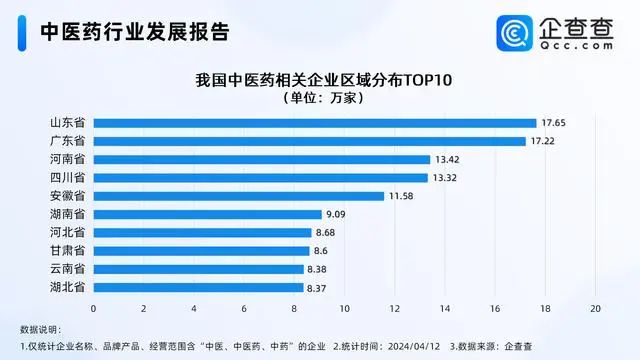 企查查数据显示,从区域来看,山东现存17.65万家中医药相关企业,位居第一。广东紧随其后,现存17.22万家,位居第二。河南现存13.42万家,位居第三。此后是四川、安徽等地。