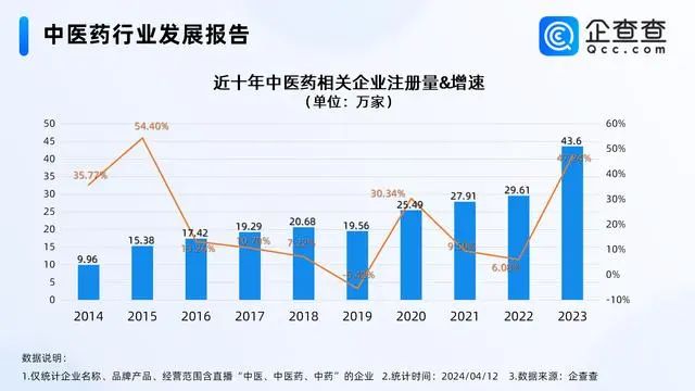 企查查数据显示,国内现存中医药相关企业203.69万家。近十年,其相关企业注册量呈整体增长态势,且增速差值较小。2023年其注册量及增速迎来近五年双峰值,首次突破40万家,同比增长47.24%至43.6万家。