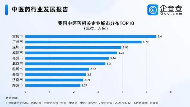 企查查数据显示,从城市来看,重庆现存5.4万家中医药相关企业,位居第一。广州、深圳分别现存4.79万家、3.96万家,位居前三。此后是成都、亳州、北京等地。