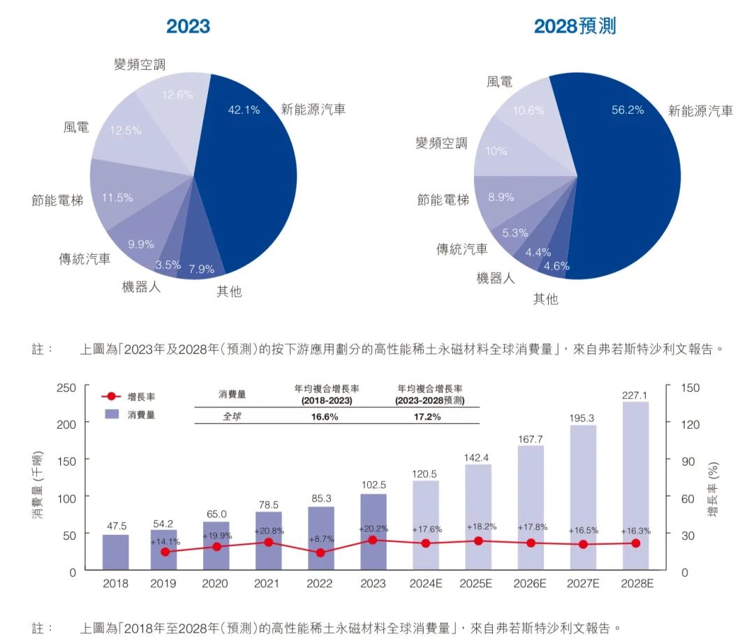 根据弗若斯特沙利文的报告, 全球新能源汽车市场对稀土永磁材料的消费量从 2018 年的 0.64 万吨增加至 2023 年的 4.32 万吨,复合年增长率达约 46.5%。到 2028 年全球新能源汽车市场对稀土永磁材料的消费量预期将达到 12.76 万吨,2023 年至 2028 年的复合年增长率为 24.2%。