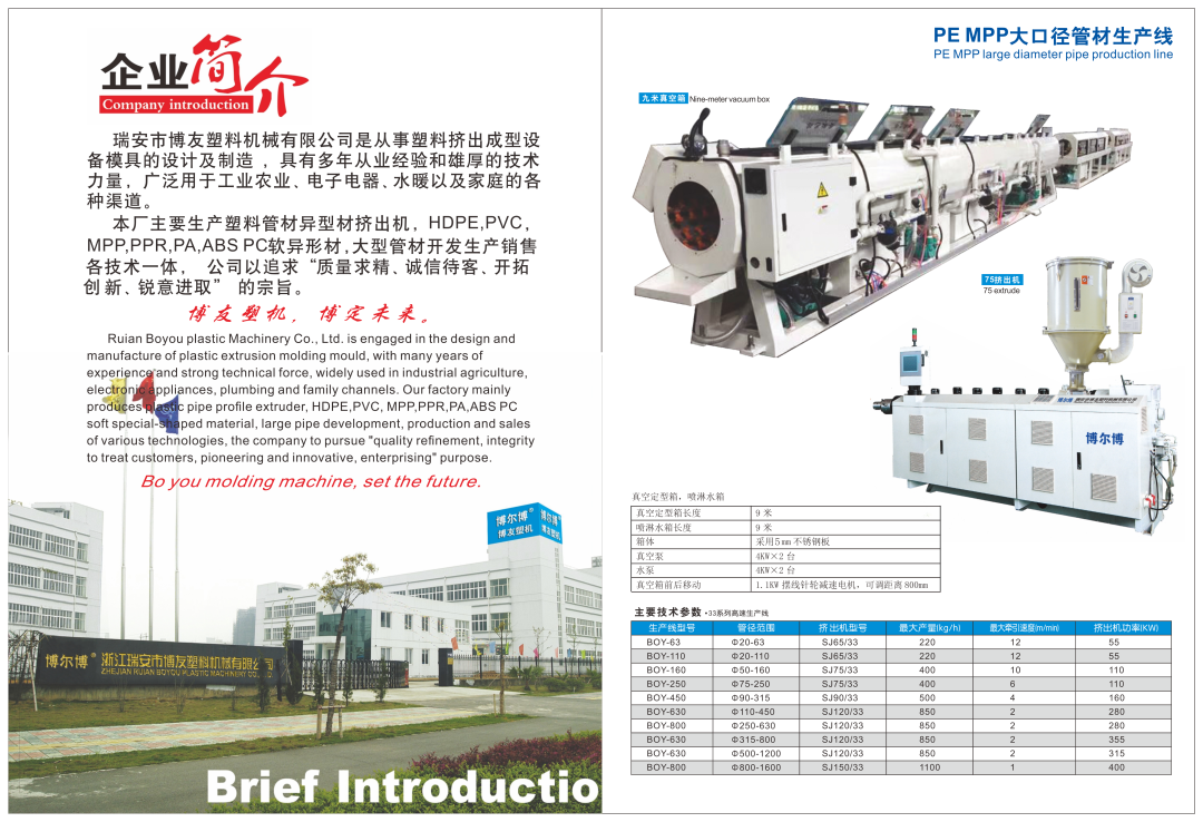 瑞安市博友塑料机械有限公司是从事塑料挤出成型设备模具的设计及制造,具有多年从业经验和雄厚的技术力量,广泛用于工业农业、电子电器、水暖以及家庭的各种渠道。
