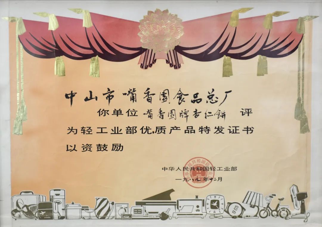 在咀香园展厅里,泛黄的奖状记录着咀香园发展中的“高光时刻”。看着沉甸甸的奖状,张延杰董事无比自豪地回忆起当年的情形。1989年,中山市咀香园食品总厂生产的白莲蓉蛋黄月饼、杏仁饼被当时的国家轻工业部评为优质产品。